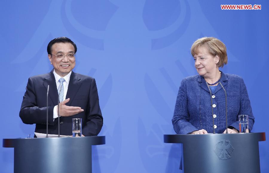 Chinese Premier Li Keqiang (L) speaks while German Chancellor Angela Merkel looks on during a press conference after their talks in Berlin, capital of Germany, May 26, 2013. (Xinhua/Ju Peng)