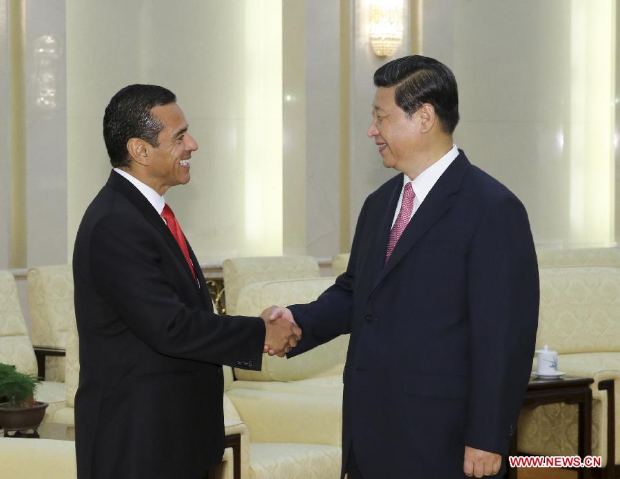 Chinese President Xi Jinping (R) meets with Antonio Villlaraigosa, mayor of Los Angeles of the United States, at the Great Hall of the People in Beijing, capital of China, May 28, 2013. (Xinhua/Ding Lin)