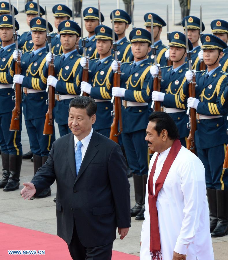 Chinese President Xi Jinping (L, front) holds a welcoming ceremony for President of Sri Lanka Mahinda Rajapakse in Beijing, capital of China, May 28, 2013. (Xinhua/Liu Jiansheng)