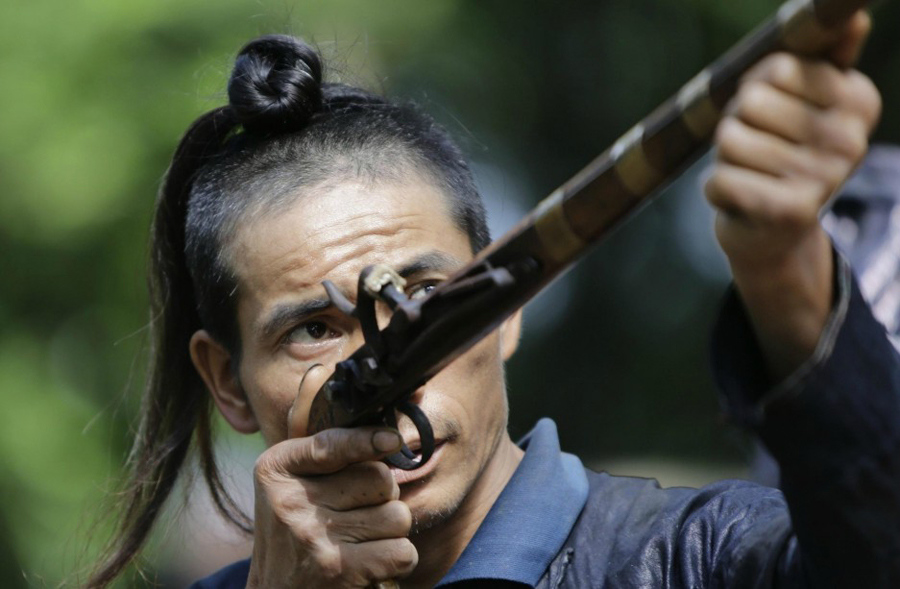 Ethnic Miao man Gun Liangma, 44, takes aim during a performance for tourists in the village of Basha in Congjiang county, Southwest China's Guizhou province, May 21, 2013. The village, an old ethnic Miao settlement with a population of 2,200, is believed to be the last community authorized by the Chinese government to keep guns. Although people in Basha no longer subsist on hunting, guns and gunpowder pots have become part of their traditional dress, while firing towards the sky is seen as a ritual to welcome guests, according to local media. [Photo/Agencies]