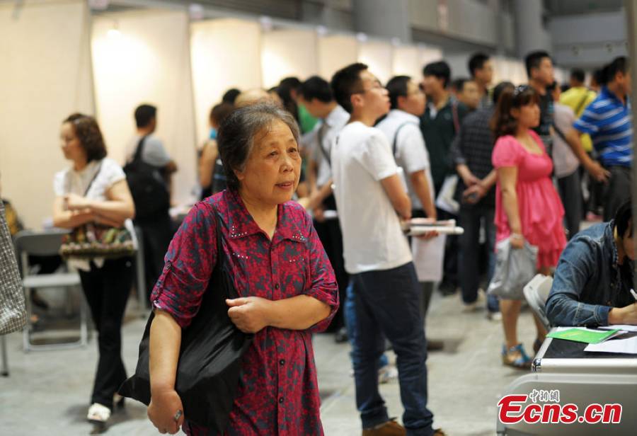 A gray-haired granny walks in a job fair at the Nanping Convention Center in southwest China's Chongqing Municipality, May 26, 2013. The 73-year-old woman delivered resumes for her grandchild who was stuck at another job fair. China will see a record-high 6.99 million people graduate from college this year, according to Xinhua, the national news agency. [CFP Photo]