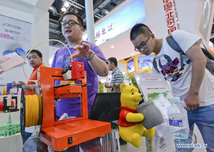 An exhibitor displays Weenie Bear printed by a 3D printer at China Beijing International Fair for Trade in Services (Beijing Fair) in Beijing, capital of China, May 29, 2013. (Xinhua/Zheng Yong)