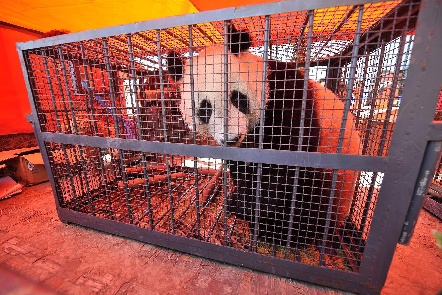 People greet a giant panda at Wusu International Airport in Taiyuan, capital of north China's Shanxi Province, May 30, 2013. The panda pair from the Bifengxia Panda Base in southwest China's Sichuan Province arrived in Taiyuan by airplane Thursday, starting their one-year sojourn at the Taiyuan Zoo. (Xinhua/Zhan Yan)