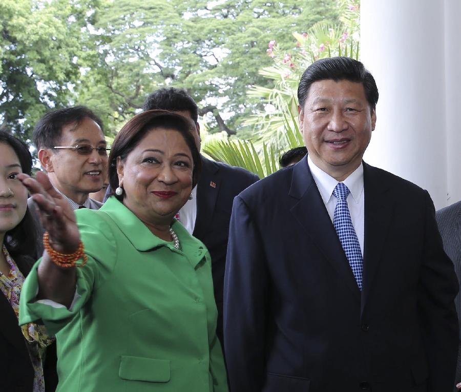 Chinese President Xi Jinping (R) is welcomed by Prime Minister of Trinidad and Tobago Kamla Persad-Bissessar before their talks in Port of Spain, Trinidad and Tobago, June 1, 2013. (Xinhua/Ding Lin)