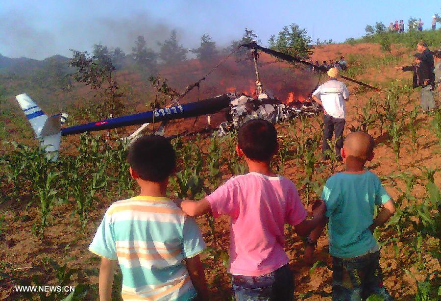 People look at the wreckage of a crashed police helicopter in Lantian County in northwest China's Shaanxi Province, June 3, 2013. Two people died and another person was severely injured after the helicopter crashed during a training mission on Monday, local authorities said. (Xinhua)