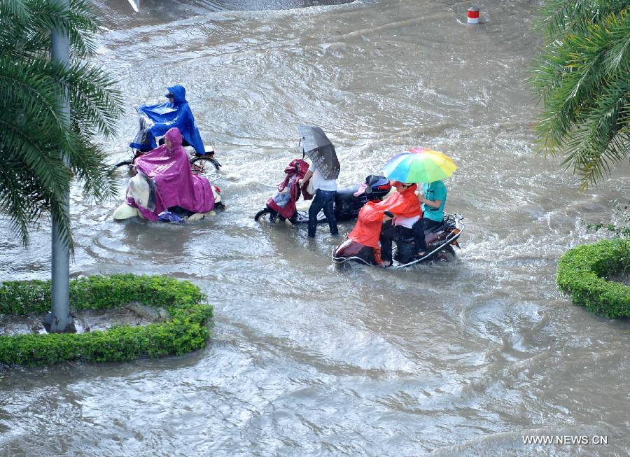 People ride in floods in Nanning City, south China's Guangxi Zhuang Autonomous Region, June 4, 2013. A heavy rainfall hit Nanning on Tuesday, and local meteorological authorities issued an orange alert for rainstorms. China has a four-color warning system for strong rain, with red being the most serious, followed by orange, yellow and blue. (Xinhua/Zhou Hu)