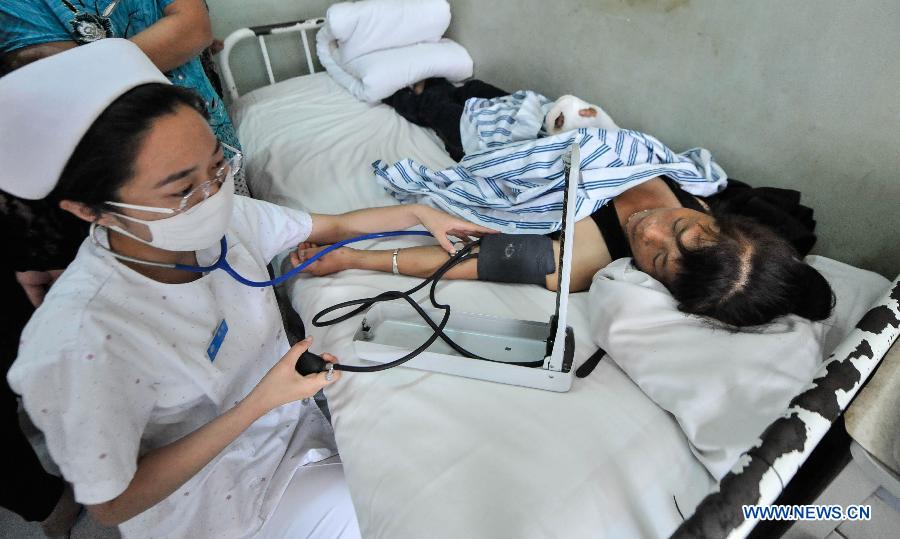 A nurse checks the blood pressure of a woman injured in a fire accident in hospital in Changchun, capital of northeast China's Jilin Province, June 5, 2013. A fire broke out at a poultry processing workshop owned by the Jilin Baoyuanfeng Poultry Company in Mishazi Township in the city of Dehui on early Monday morning. The fire killed 120 people and injured 77 others. (Xinhua/Wang Haofei)