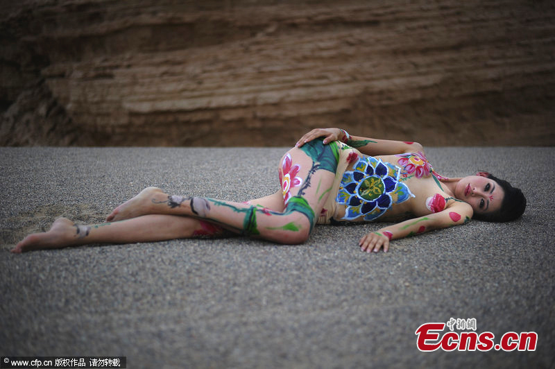 A model poses for photos in front of the Mogao Grottoes in Jiuquan City, Northwestern China’s Gansu Province, June 4, 2013. The models are volunteers for a campaign to protect the Mogao Grottoes. The campaign, which was initiated by the non-governmental organization Idea Beautify China, also aims to raise awareness about preserving historic and cultural heritage elsewhere. [Photo: CFP]