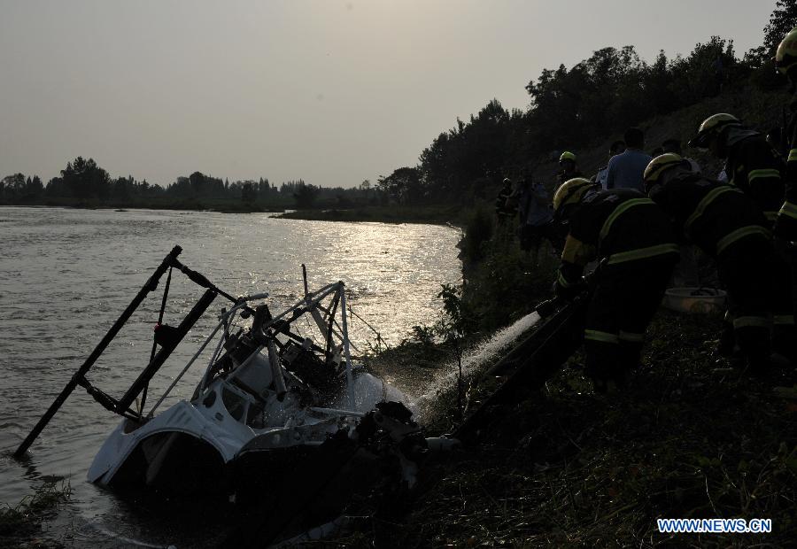 Rescuers work at the site where a helicopter crashed on the Qingbaijiang River in Guanghan City, southwest China's Sichuan Province, June 6, 2013. The crash occurred around 5:13 p.m. (GMT 0913), killing one crew member and injuring the other. The cause of the crash is under investigation. (Xinhua)
