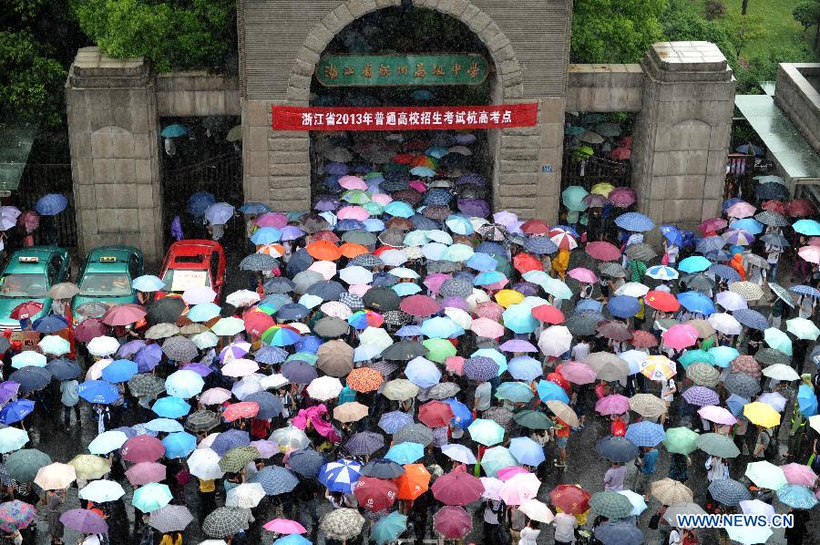 Parents holding umbrellas wait in rain as their children taking the national college entrance exam at the Hangzhou High School in Hangzhou, capital of east China's Zhejiang Province, June 7, 2013. Some 9.12 million applicants are expected to sit this year's college entrance exam on June 7 and 8. (Xinhua/Ju Huanzong)