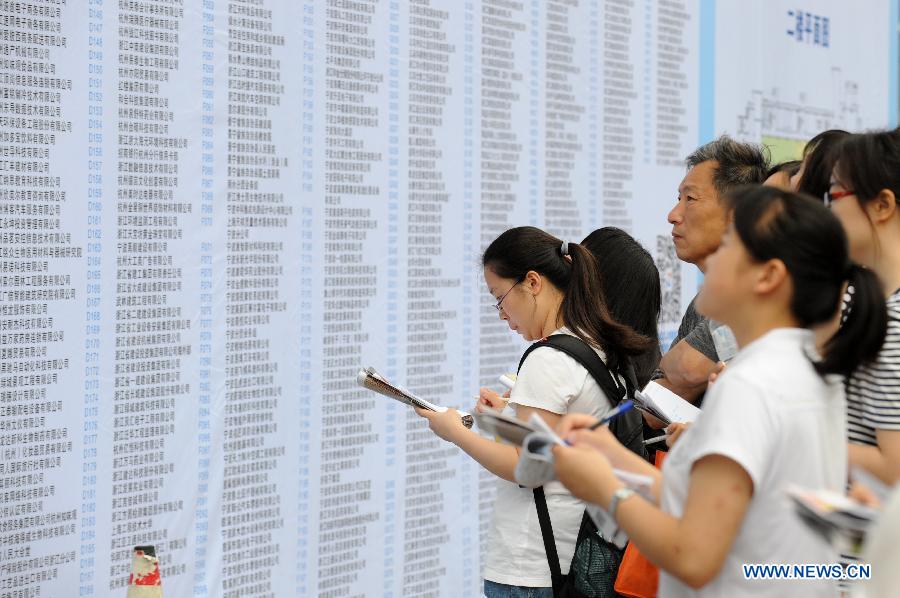 Students and parents check job information at a job fair in Hangzhou, capital of east China's Zhejiang Province, June 8, 2013. The job fair offered over 25,000 job posts to college graduates. (Xinhua/Ju Huanzong)