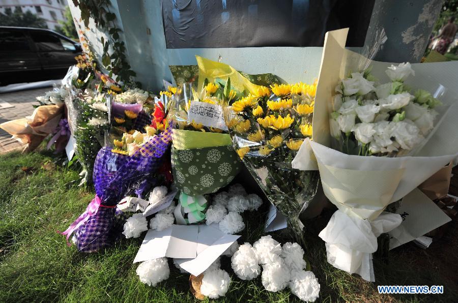 Flowers are laid to mourn for the victims in front of a pier of the elevated bus lane where a bus fire took place on Friday, in Xiamen, southeast China's Fujian Province, June 8, 2013. The bus fire has claimed 47 lives and hospitalized 34 passgengers. (Xinhua/Wei Peiquan)