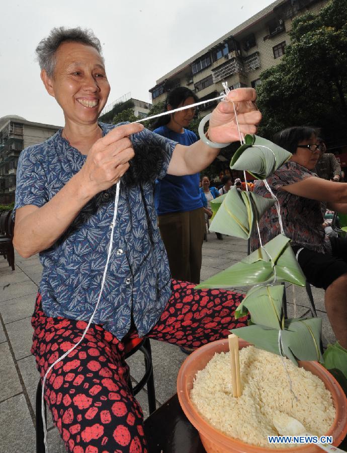 A contestant makes Zongzi, a pyramid-shaped dumpling made of glutinous rice wrapped in bamboo or reed leaves, during a contest in celebration of the upcoming Dragon Boat Festival in Changsha, capital of central China's Hunan Province, June 9, 2013. The Dragon Boat Festival falls on the fifth day on the fifth month on the lunar calendar. (Xinhua/Long Hongtao)