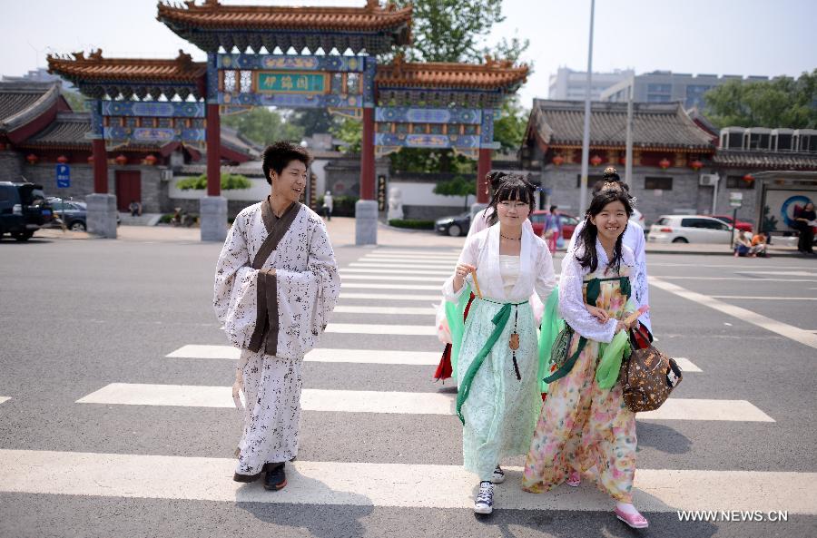 People wearing the archaic costumes typical of the Han Dynasty (202 BC - 221 AD) walk across a street during an event to commemorate Quyuan, a famous ancient official who drowned himself for finding no way to make his small hinterland kingdom better, and spend the holiday of Dragon Boat Festival in Beijing, China, June 12, 2013. (Xinhua/Wang Jianhua)