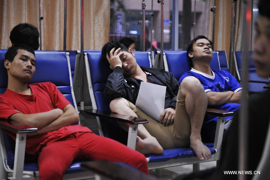 Employees of the Hsu Chi Food Co. Ltd receive treatment in a hospital in Dongguan, south China's Guangdong Province, June 11, 2013. A total of 160 staff from the food company were suspected of suffering from food poisoning, a company source said on Wednesday. (Xinhua/Wu Lu)