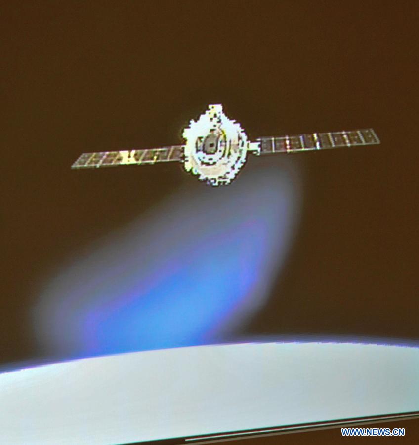 Photo taken on June 13, 2013 shows the screen at the Beijing Aerospace Control Center showing the Shenzhou-10 manned spacecraft conducting docking with the orbiting Tiangong-1 space module. China's Shenzhou-10 manned spacecraft successfully completed an automated docking with the orbiting Tiangong-1 space module at 1:18 p.m. Thursday.(Xinhua/Wang Yongzhuo)
