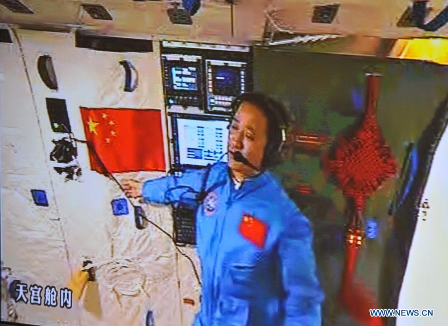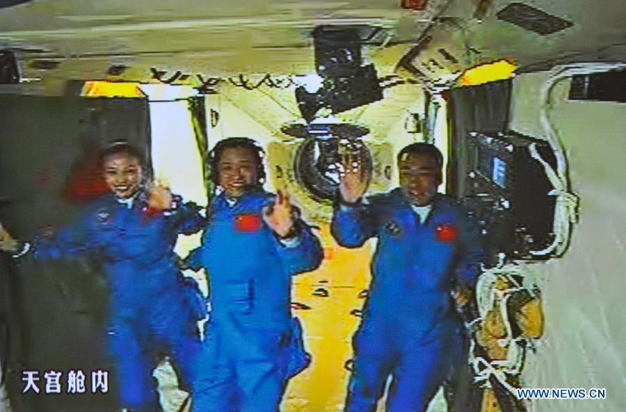 Photo taken on June 13, 2013 shows the screen at the Beijing Aerospace Control Center showing the three Chinese astronauts waving hands at the Tiangong-1 space module. China's Shenzhou-10 manned spacecraft successfully completed an automated docking with the orbiting Tiangong-1 space module at 1:18 p.m. Thursday and the astronauts Nie Haisheng, Zhang Xiaoguang and Wang Yaping opened the hatch of Tiangong-1 at 4:17 p.m. (Xinhua/Wang Yongzhuo)