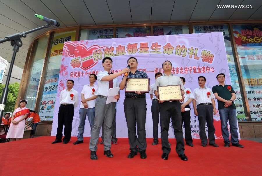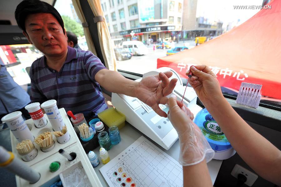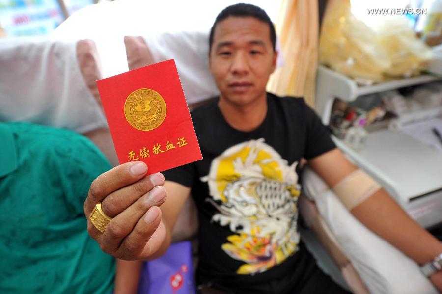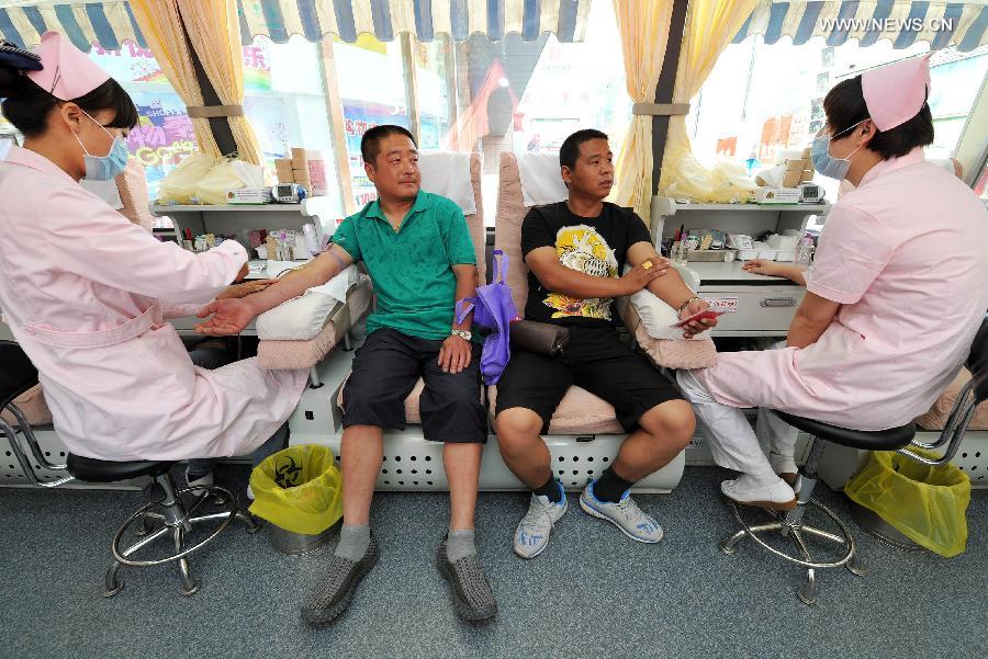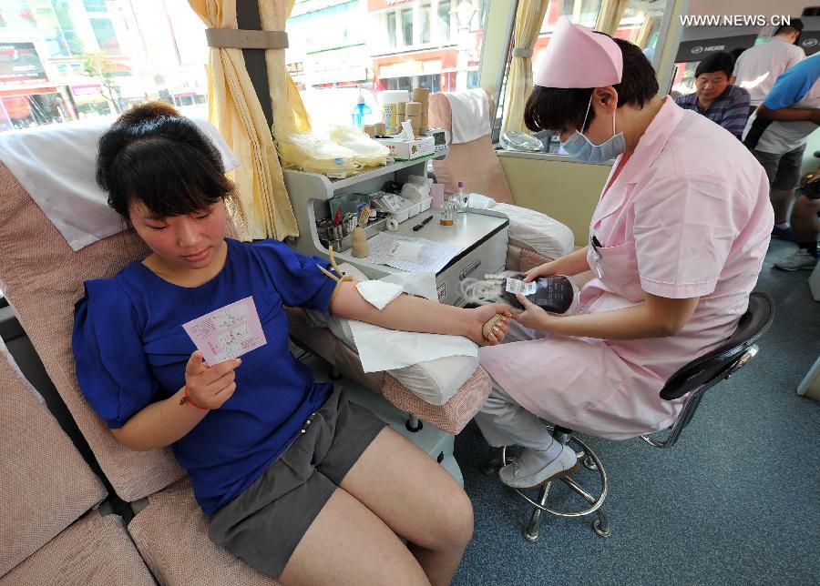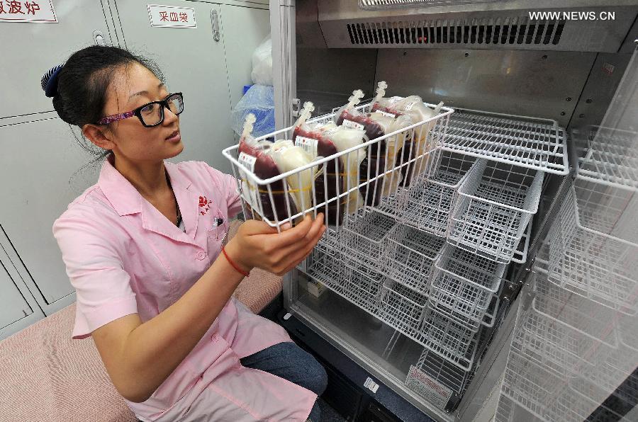 A medical staff member puts the donated blood into a storage in a voluntary blood donation house in Yinchuan, capital of Ningxia Hui Autonomous Region, June 14, 2013. June 14 is the World Blood Donor Day. Many citizens in Yinchuan donated their blood for free on the streets of Yinchuan on Friday. (Xinhua/Peng Zhaozhi)