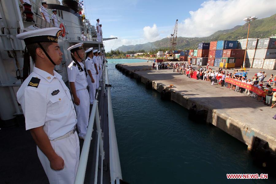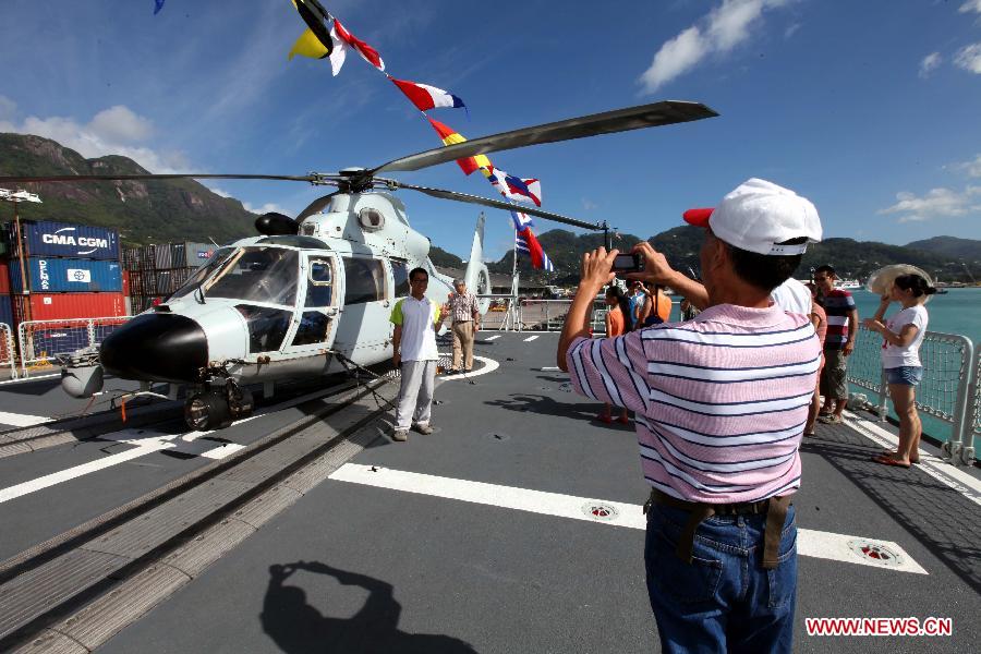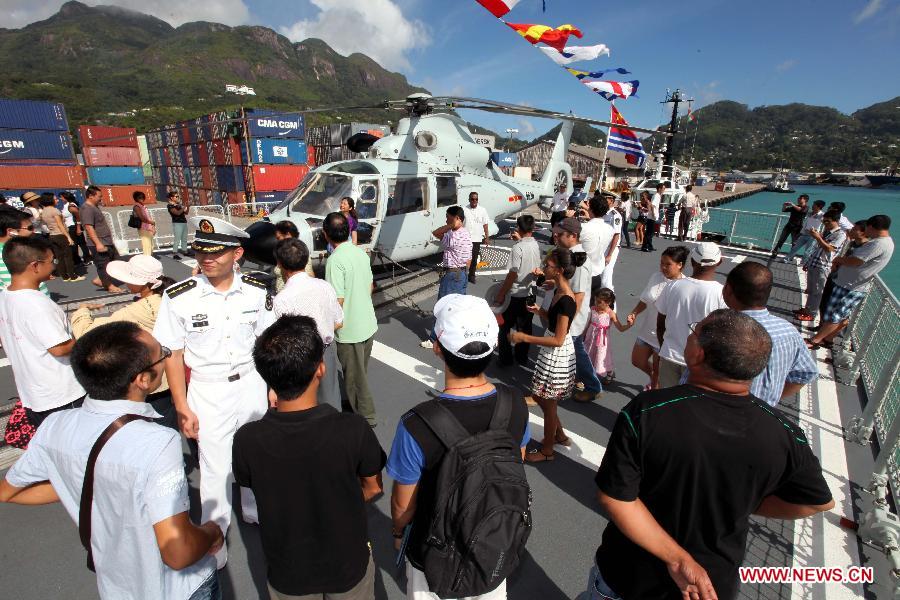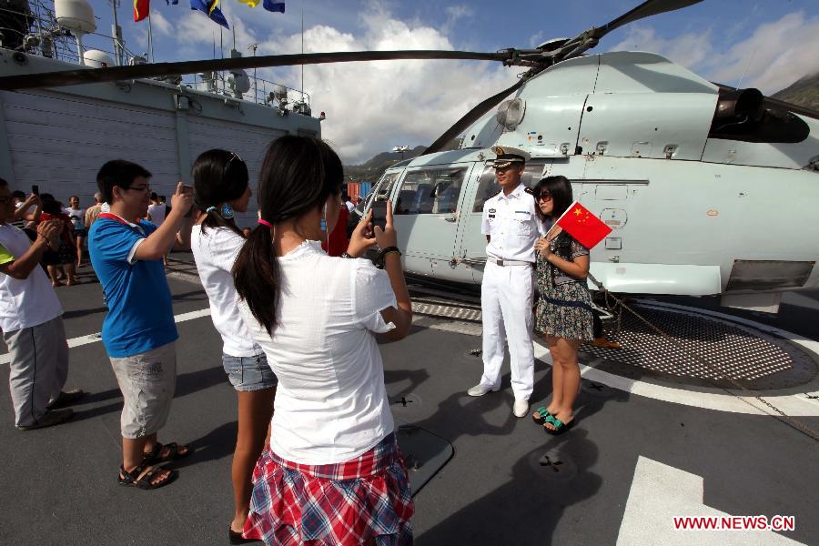 People take photos of the missile destroyer "Harbin" of the 14th Escort Taskforce of the Chinese Navy on Victoria Harbour, Seychelles, June 16, 2013. (Xinhua/Rao Rao)