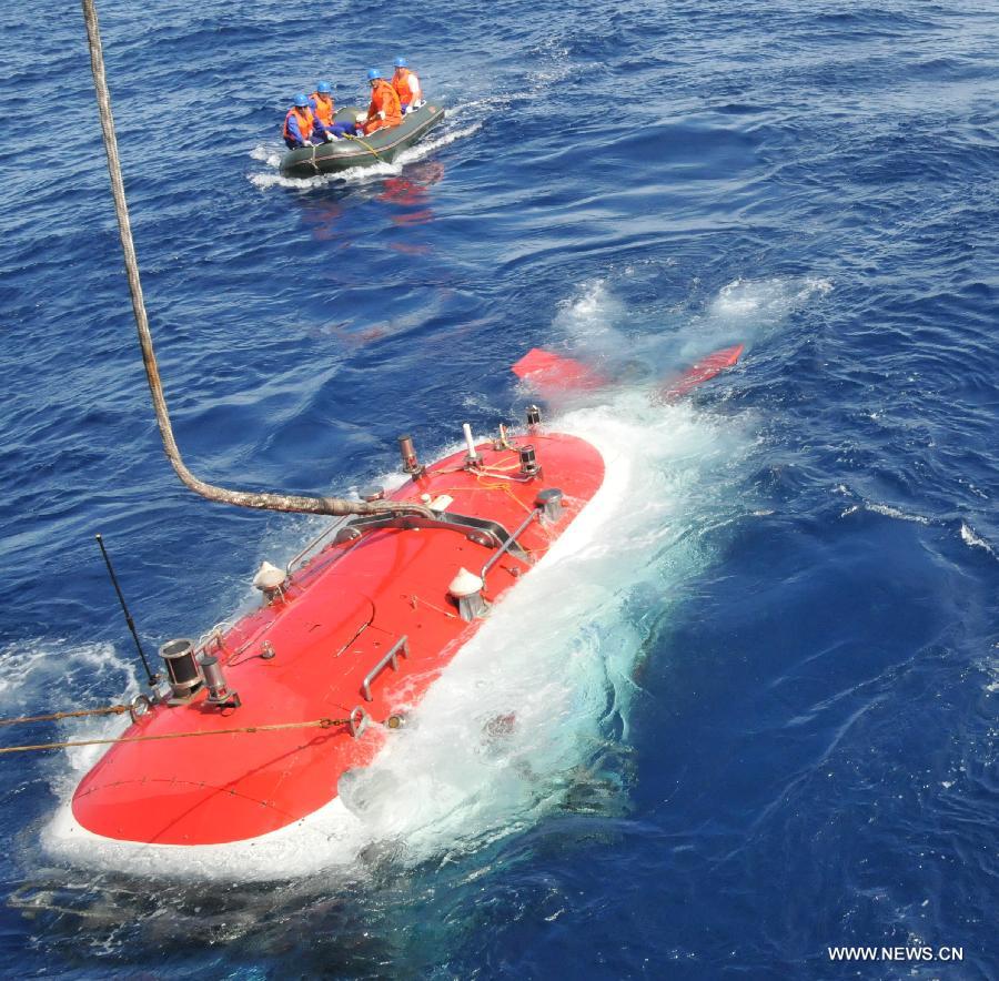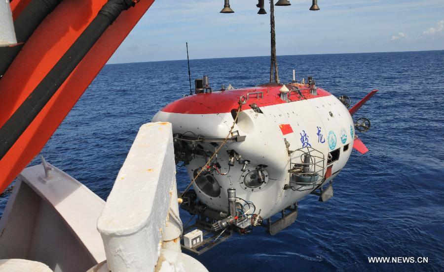 Photo taken on June 17, 2013 shows China's manned deep-sea submersible Jiaolong in the South China Sea, south China. Jiaolong conducted the first diving operation for its first voyage of experimental application in the South China Sea Monday morning. Jiaolong set a new dive record after reaching a depth of 7,062 meters in the Pacific Ocean's Mariana Trench in June 2012. (Xinhua/Zhang Xudong)