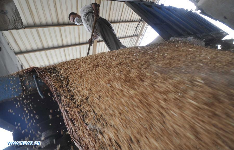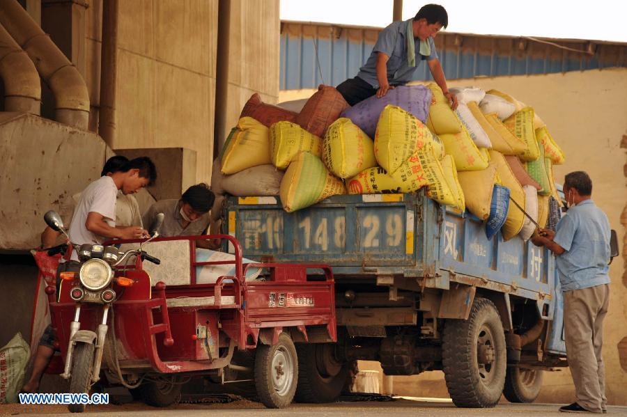 Farmers deliver their harvested wheat in a provincial grain company in Xinjiang County, Yuncheng City, north China's Shanxi Province, June 16, 2013. As the harvest of wheat approaches an end, the Yuncheng City starts its wheat purchasing. (Xinhua/Gao Xinsheng)