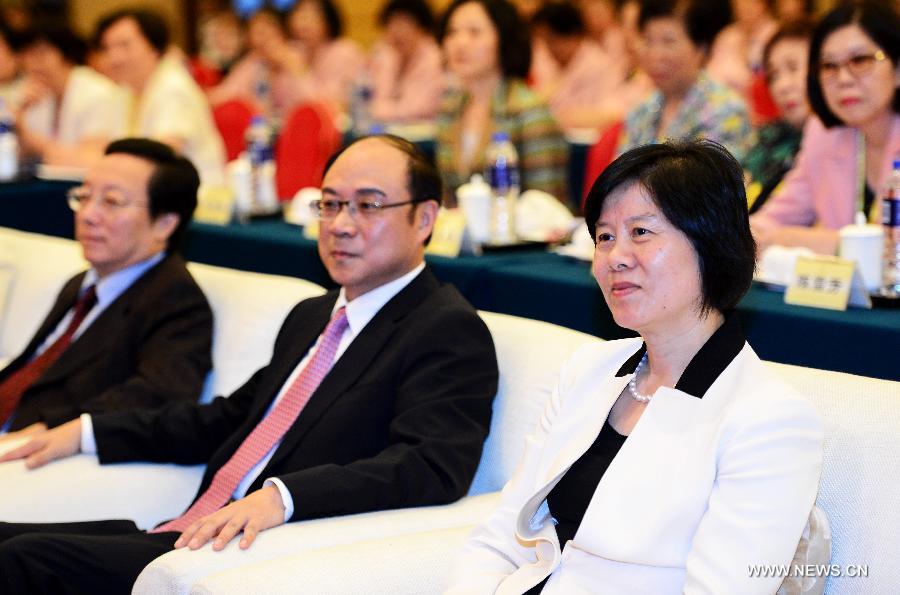 Shen Yueyue, vice chairwoman of the Standing Committee of the National People's Congress and president of the All-China Women's Federation, addresses the opening ceremony of a sub-forum themed on women of the fifth Straits Forum in Xiamen, southeast China's Fujian Province, June 16, 2013. (Xinhua/Zhang Guojun)