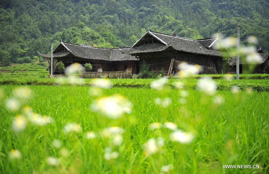 Two villagers stand in front of a wooden Diaojiaolou, or stilted house founded in the Qing Dynasty in Shiyanping Village, Wangjiaping Township of Zhangjiajie City in central China's Hunan Province. The Shiyanping Village, located in the southeast of Wangjiaping, is one of the regions in Hunan where stilted houses are well preserved. With a toal of 182 existing stilted houses of the Tujia ethnic group, the village was listed as the seventh batch of important heritage sites under state protection in 2013. (Xinhua/Shao Ying)