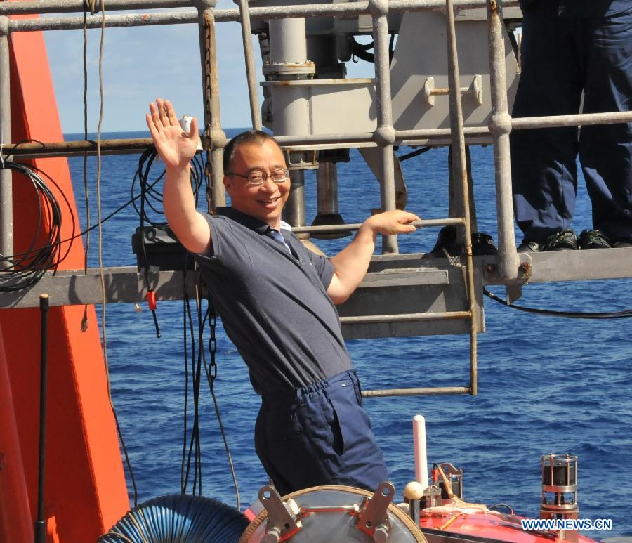 China's manned deep-sea submersible Jiaolong prepares to dive into South China Sea, June 18, 2013. The Jiaolong manned deep-sea submersible on Tuesday carried its first scientist Zhou Huaiyang, professor of the School of Ocean and Earth Science at Tongji University, as crew member during a deep-sea dive. Jiaolong left east China's city of Jiangyin on June 10 for its first voyage of experimental application. The 113-day-long mission will include experiments on Jiaolong's positioning system, as well as deep-sea ecological and geological surveys in the South China Sea, biological surveying and geological sampling in the Pacific Ocean. (Xinhua/Zhang Xudong)