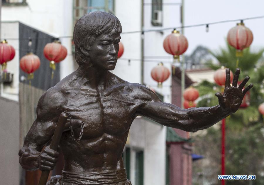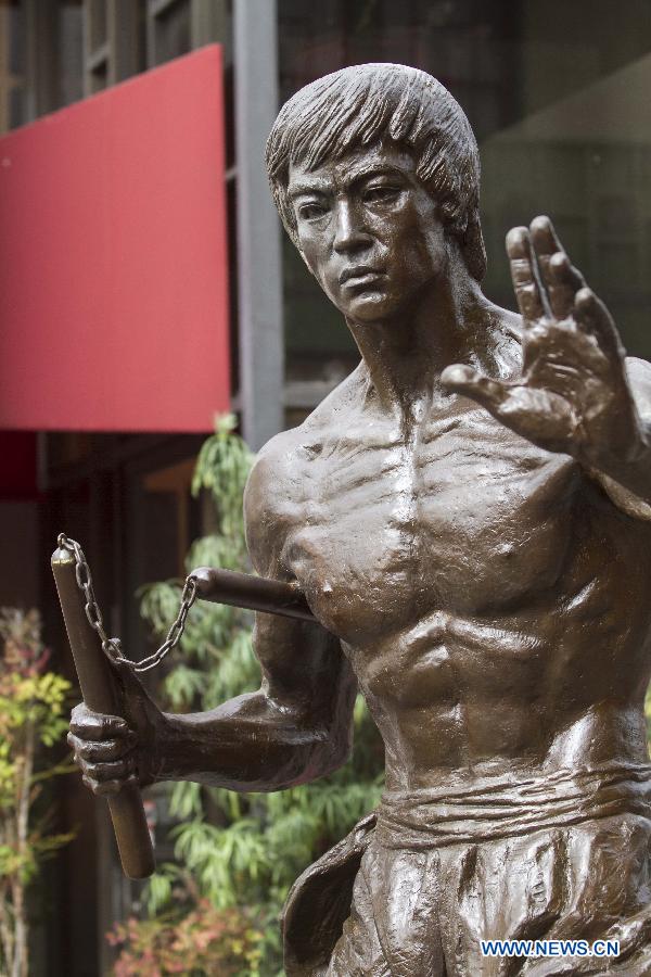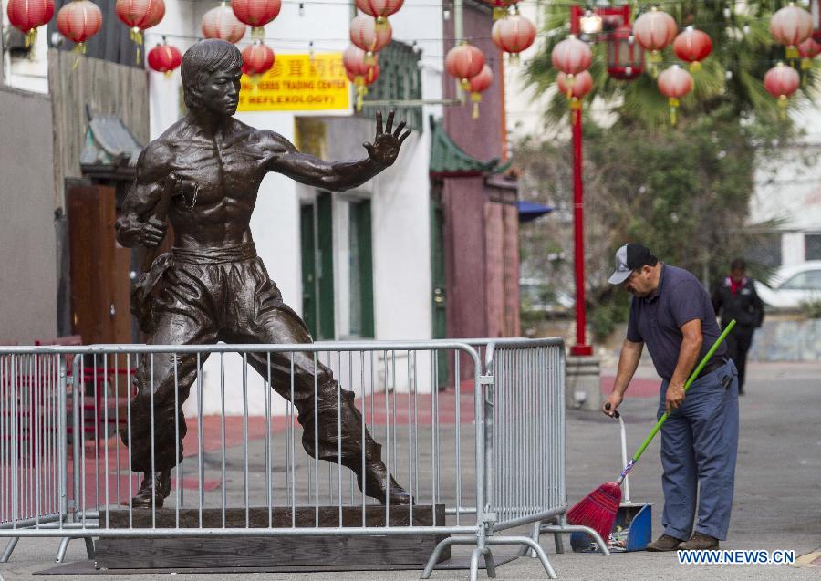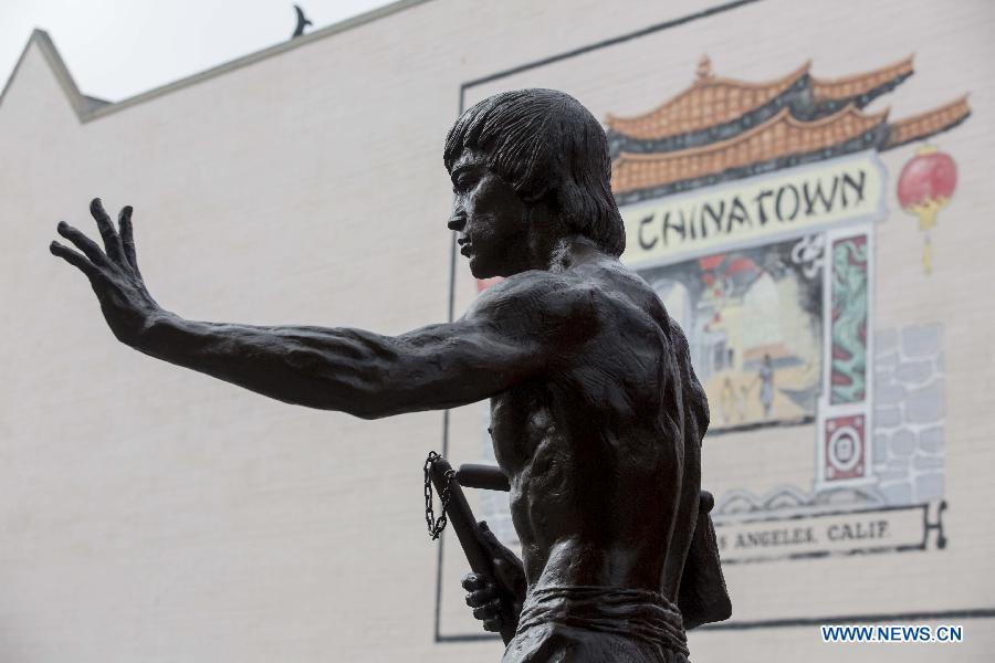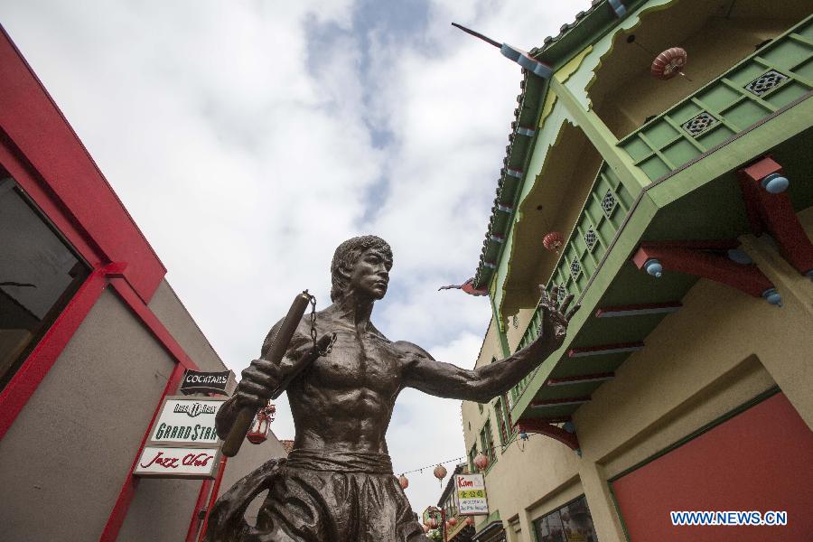 Photo taken on June 16, 2013 shows a 7.6-foot-tall bronze statue of martial arts star Bruce Lee in Los Angeles' Chinatown to mark the neighborhood's 75th anniversary. (Xinhua/Zhao Hanrong)