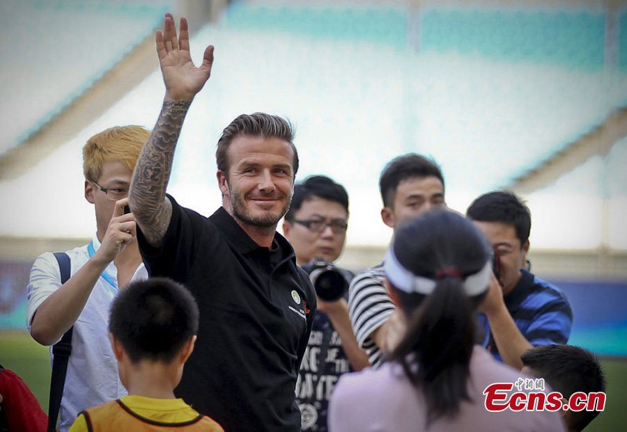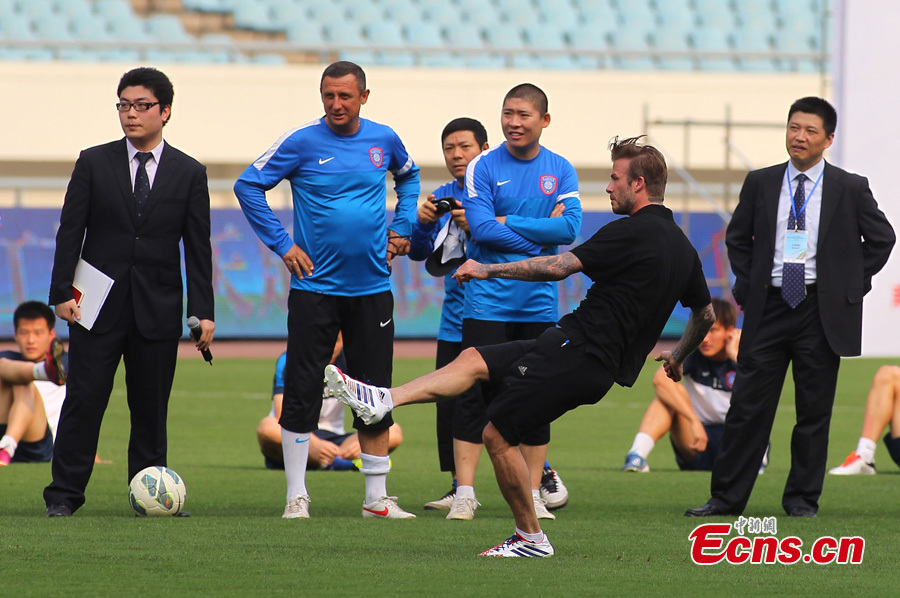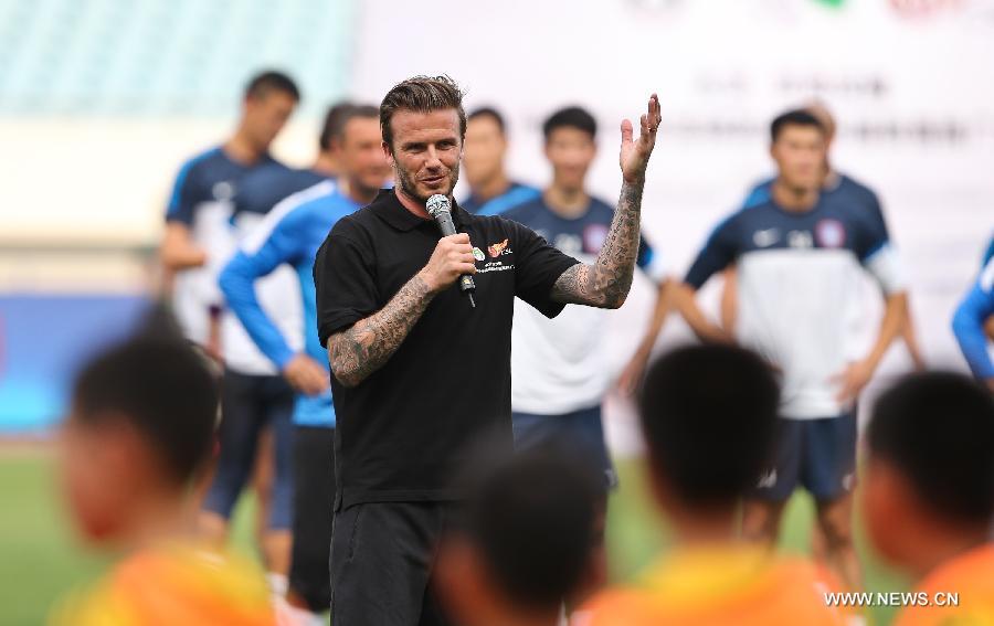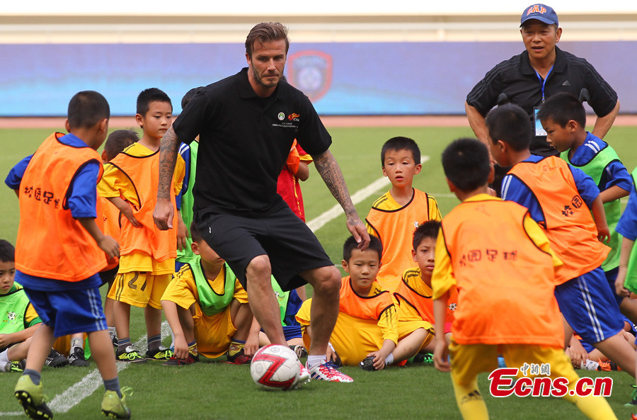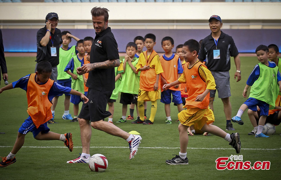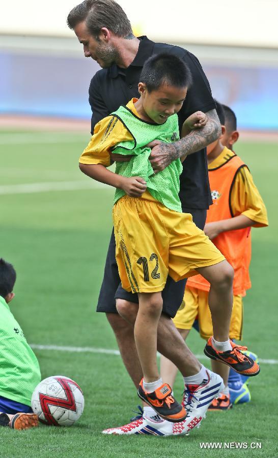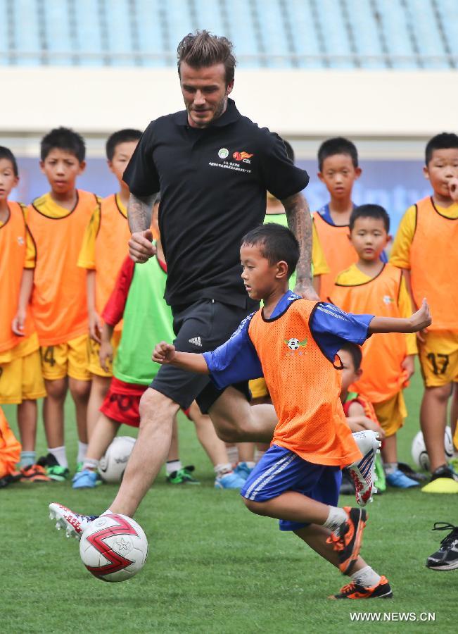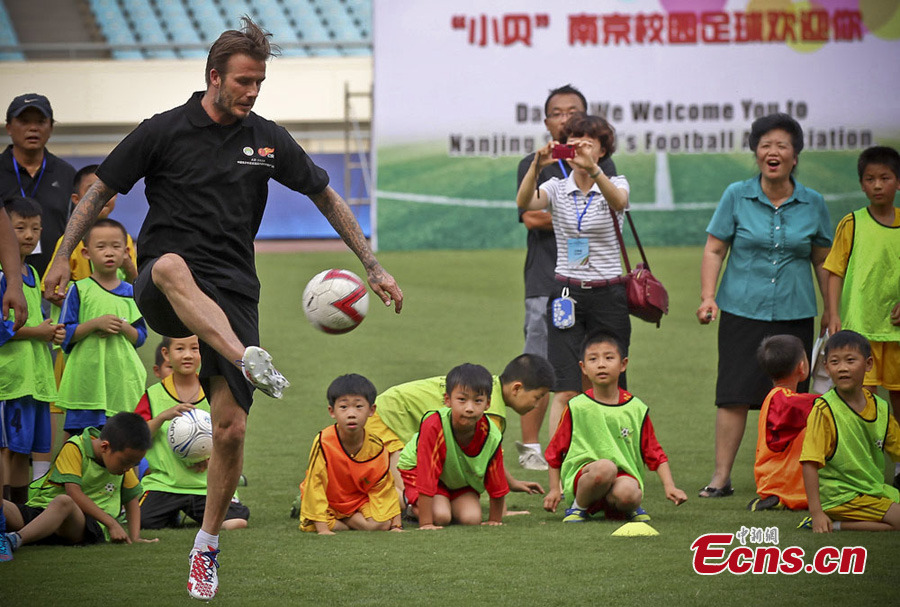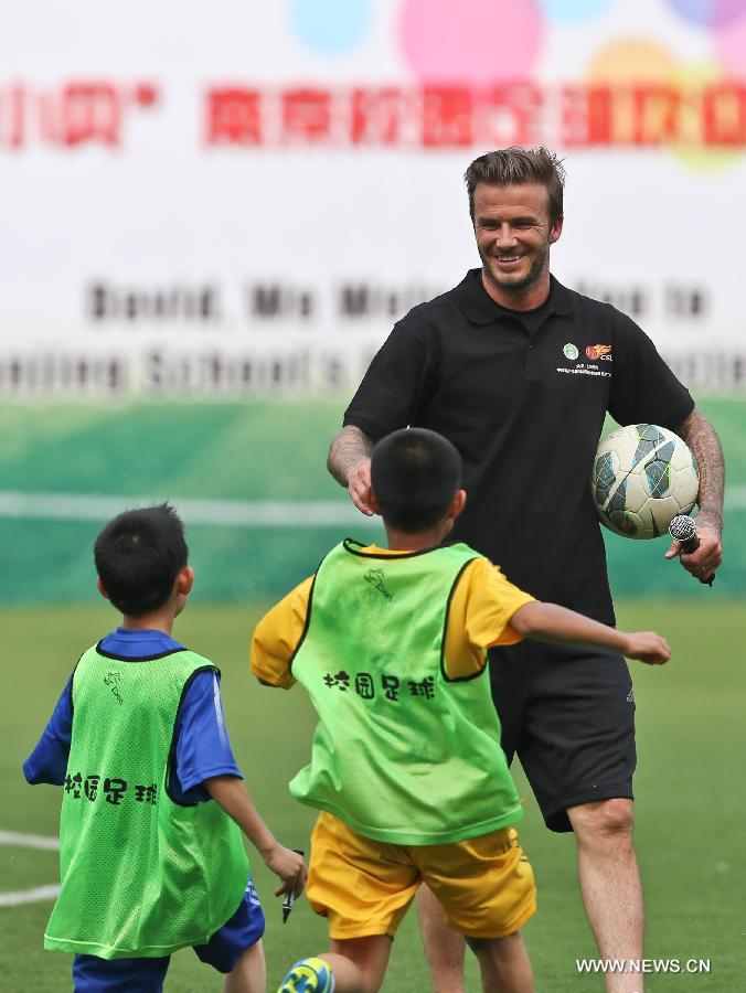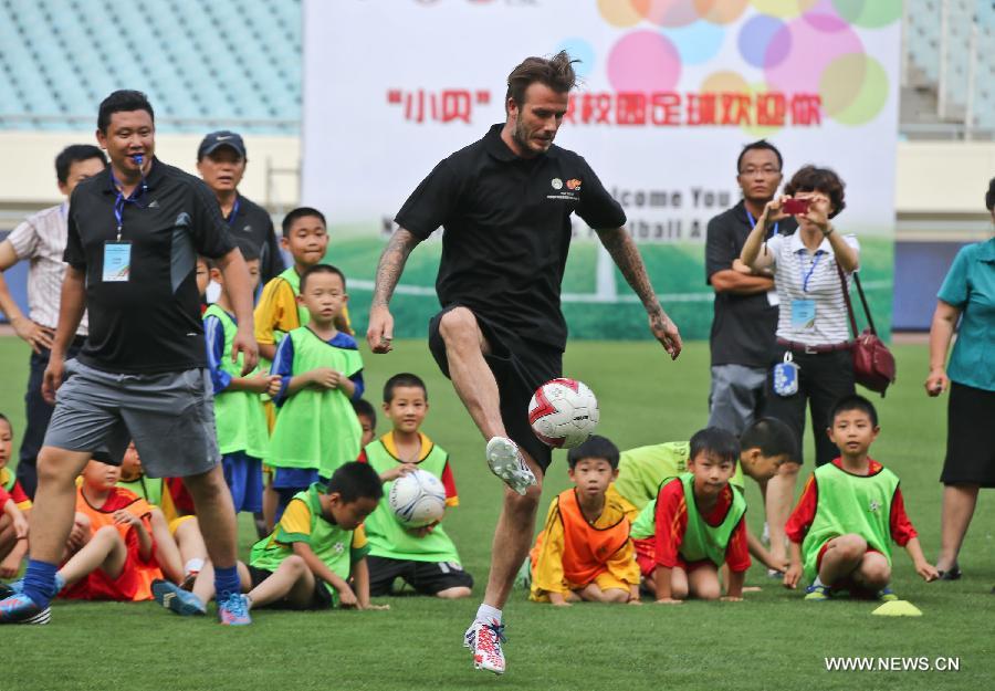 Recently retired football player David Beckham(R) takes part in a training session with students at Nanjing Olympic Center in Nanjing, east China's Jiangsu Province, June 18, 2013. Beckham is on a seven-day visit to China as the ambassador for the Football Programme in China and China's Super League. (Xinhua/Yang Lei)