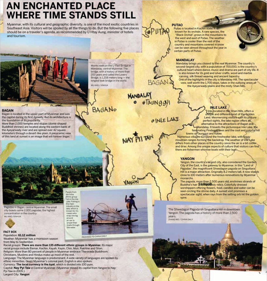 Myanmar, with its cultural and geographic diversity, is one of the most exotic countries in Southeast Asia. Visitors will be spoiled by all the things to do. But these five places should be on a traveler's agenda, as recommended by U Htay Aung, minister of hotels and tourism. (China Daily)