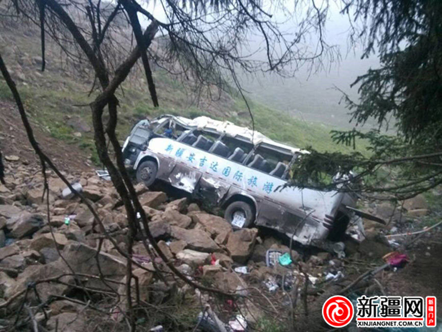Photo taken on June 18, 2013 shows the wreckage of a bus after it fell into a valley near Miaoergou village in the Changji Hui autonomous prefecture, Xinjiang Uygur Autonomous Region. The accident happened at around 5:15 pm in an area with an average altitude of 2,000 meters near Miaoergou village. At least 15 people were killed. [Photo: Xinjiangnet.com.cn]