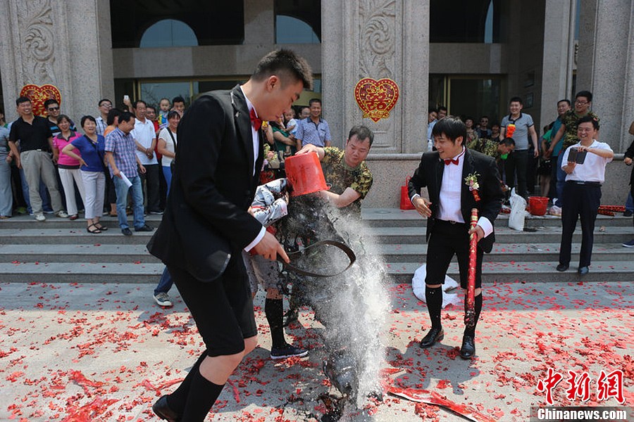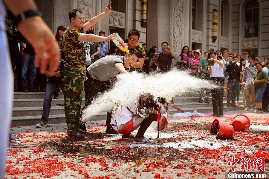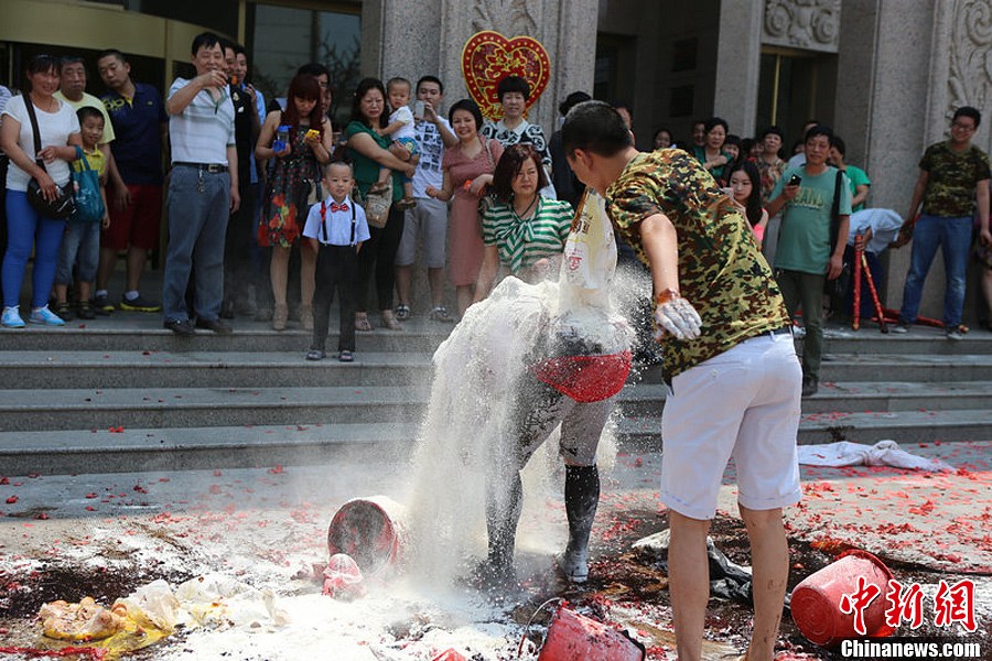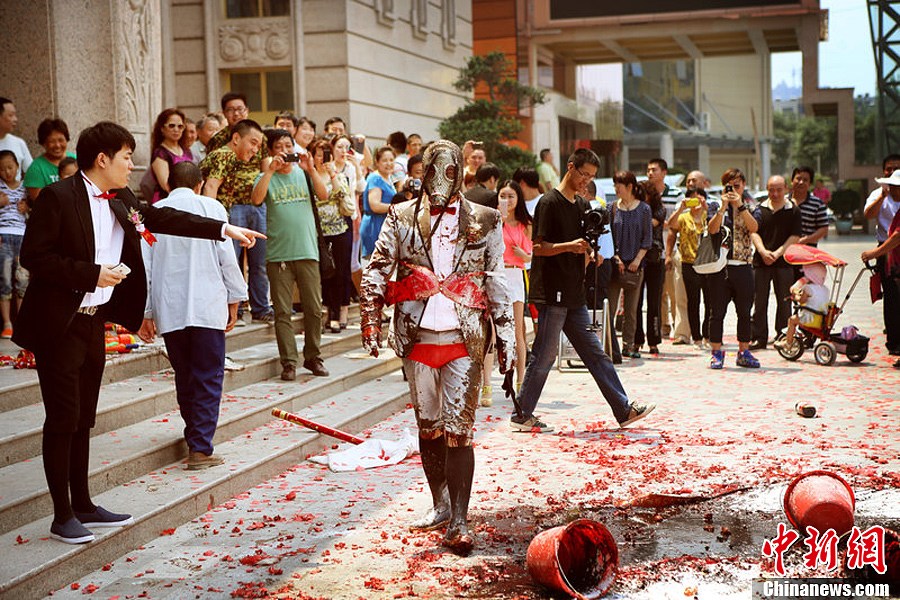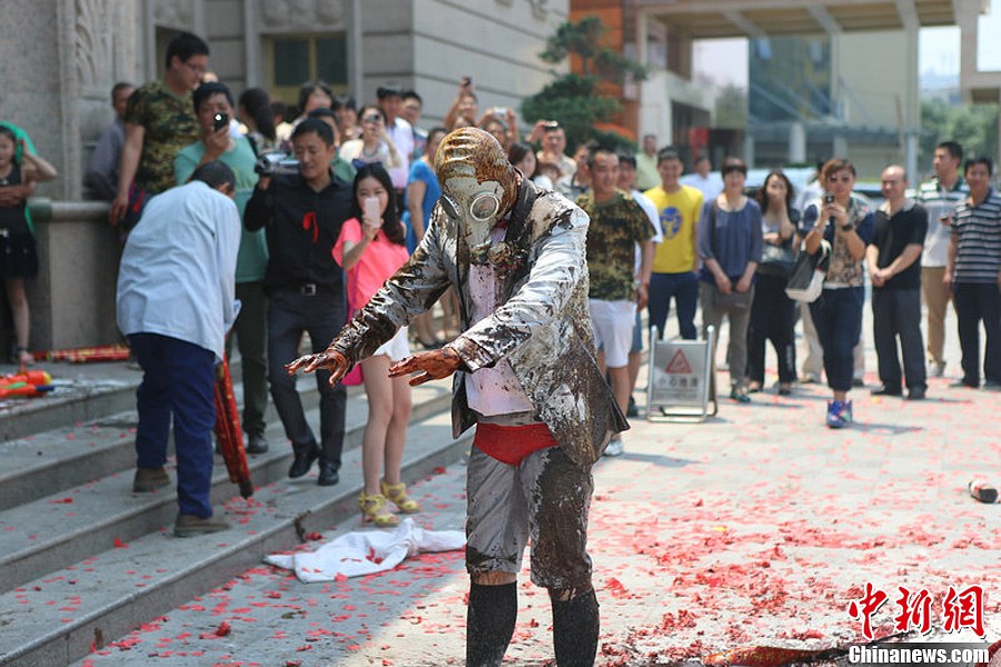 A bridegroom, dressed in women's underwear and armed with gas mask, is attacked by his relatives with oil, sauce, flour and eggs during a Resident Evil-themed wedding ceremony in Zhengzhou, capital of Central China's Henan Province in June. [Photo: CFP]