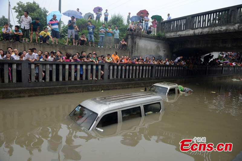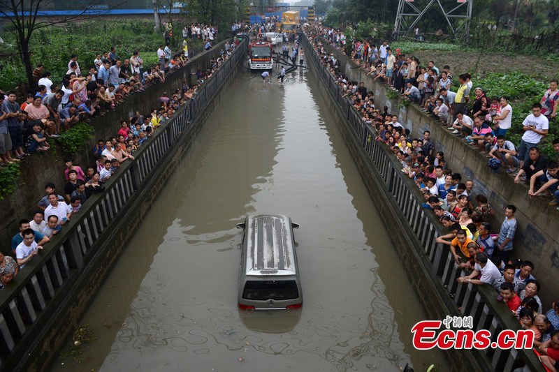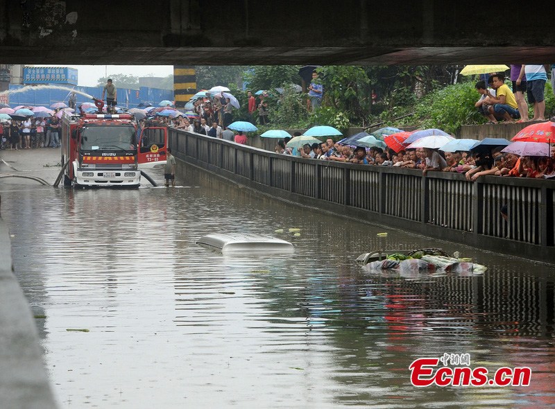 Water threatens to cover two cars in a flooded street in Chengdu, capital of Southwest China's Sichuan Province, June 20, 2013. A heavy rainstorm hit the city on Thursday. [Photo: IC Press]