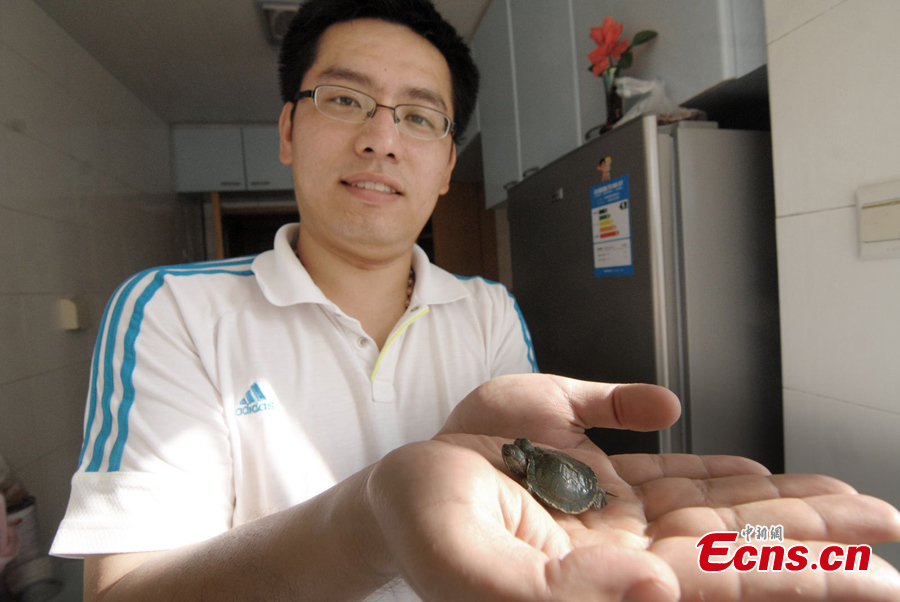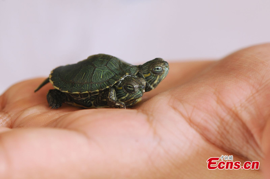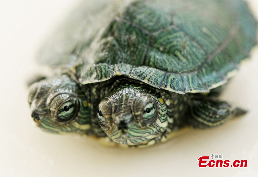 A turtle is born with two heads in Qingdao, East China's Shandong Province. The two-headed turtle, which can eat with both mouths, has gained great polarity online. [Photo: CNS/Xue Hun]