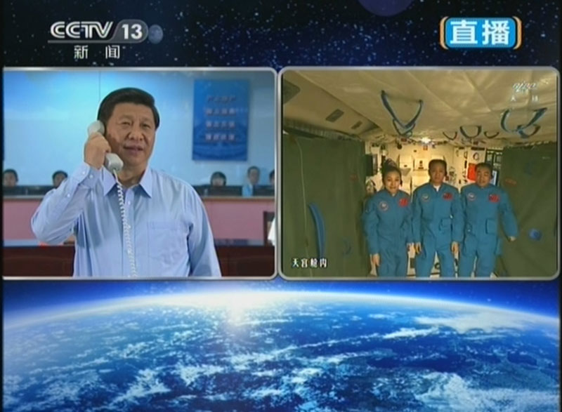 Chinese President Xi Jinping talks with astronauts aboard Tianggong-1 space lab module at the Beijing Aerospace Control Center, June 24, 2013. [Photo: CCTV]