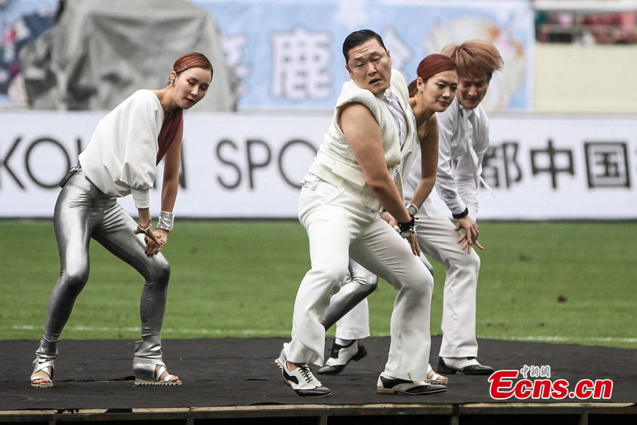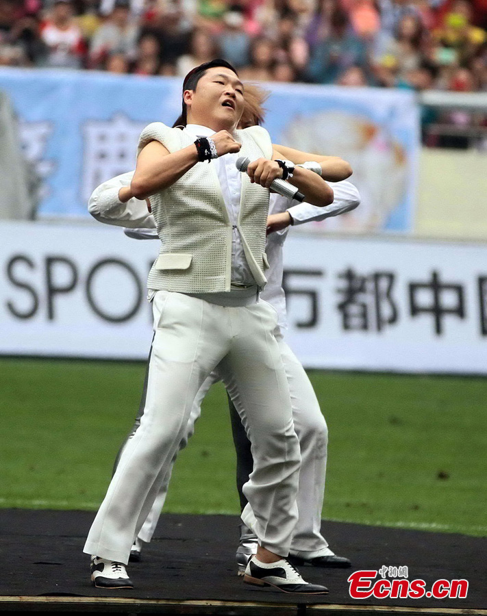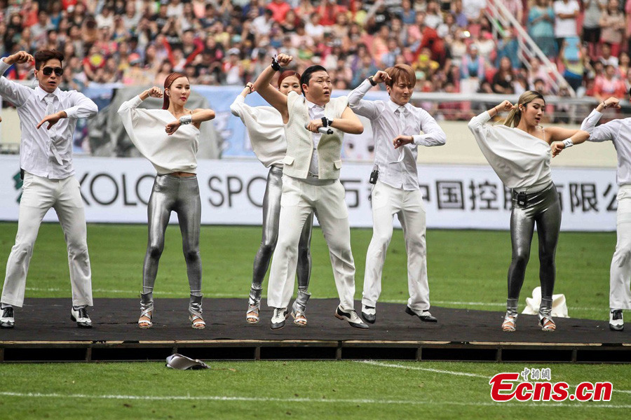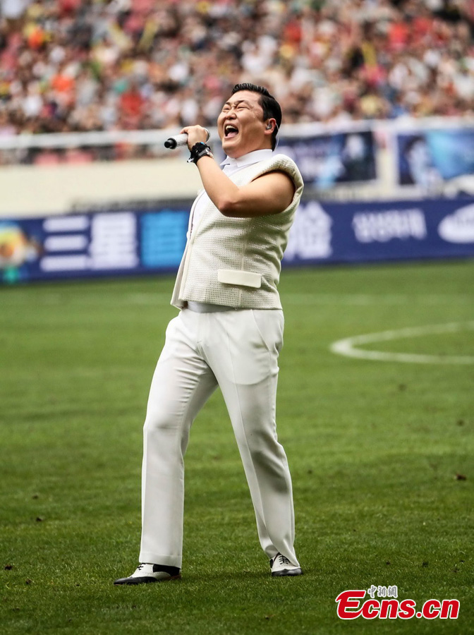 South Korean pop star Psy performs his famous Gangnam Style song at half-time at the Shanghai Asian Dream Cup at Shanghai Hongkou Football Stadium, June 23, 2013. In the charity football match, Shanghai Koehler Team Friends lost to Park Ji-sung Team Friends 0:2. [Photo: Osports]