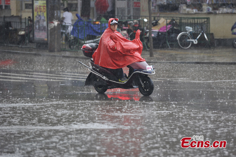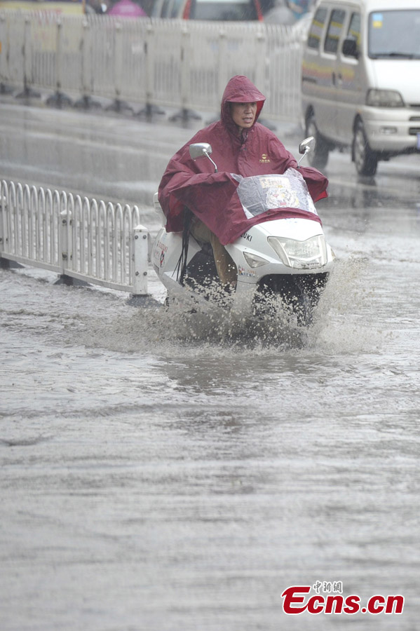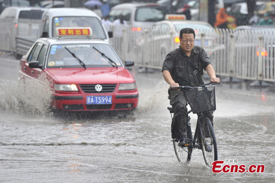 A man rides in the rain on a waterlogged street in Taiyuan, capital of North China's Shanxi Province, June 24, 2013. A torrential rain hit the city on Monday. [Photo: CNS/Wei Liang]