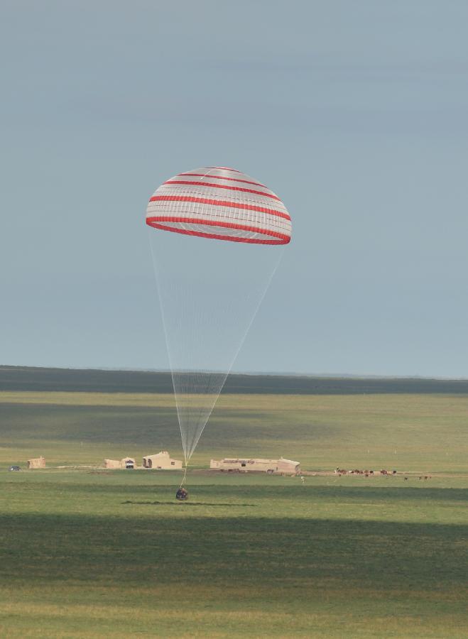The screenshot shows the working staff opening the re-entry capsule of China's Shenzhou-10 spacecraft after its successful landing at the main landing site in north China's Inner Mongolia Autonomous Region on June 26, 2013. (Xinhua)