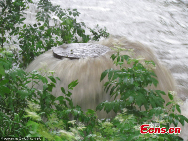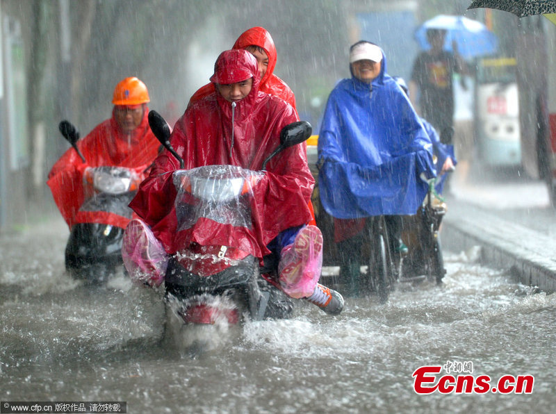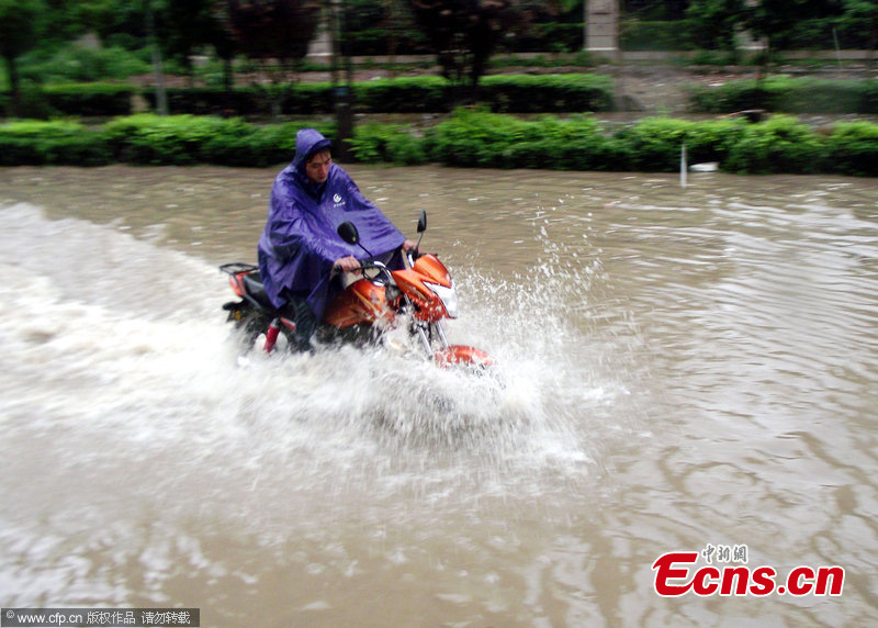 A person rides on a waterlogged street in Nanjing, capital of East China's Jiangsu Province, June 25, 2013. Heavy rainfall hit the city on Tuesday. Local meteorological center raised the rainfall alert from yellow to orange. [Photo: CFP]