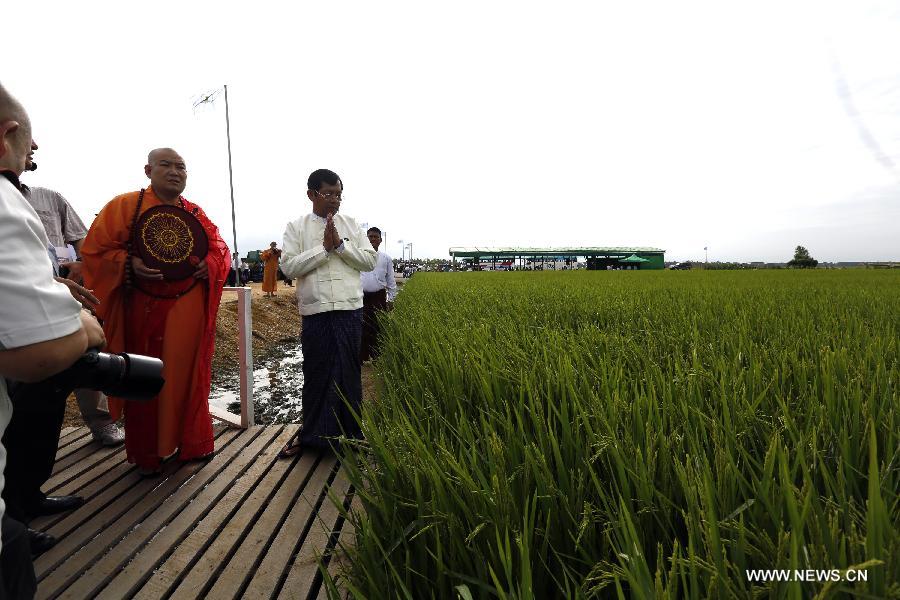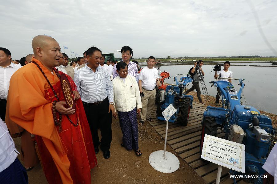 Vice Secretary-General of the Buddhist Association of China Master Shi Changzang (2nd L) inspects a paddy field during a donation ceremony in Nay Pyi Taw, capital of Myanmar, on June 25, 2013. The Buddhist Association of China on Tuesday provided a total of 55 sets of agricultural equipment including five trucks to Myanmar Ministry of Agriculture as a donation aimed at assisting the country's agricultural sector. (Xinhua/U Aung)