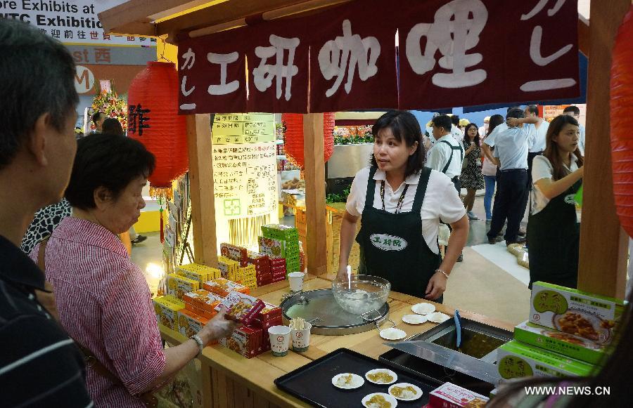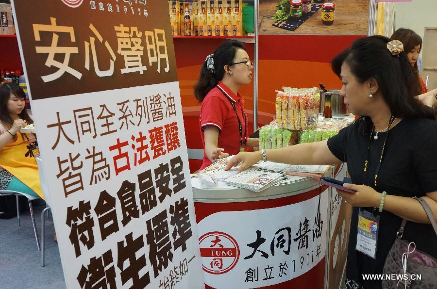 Visitors taste Spanish food at Food Taipei 2013 exhibition in Taipei, southeast China's Taiwan, June 26, 2013. The four-day Food Taipei 2013 show kicked off Wednesday at Taipei World Trade Center Nangang Exhibition Hall. (Xinhua/Tao Ming)