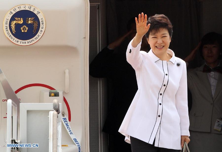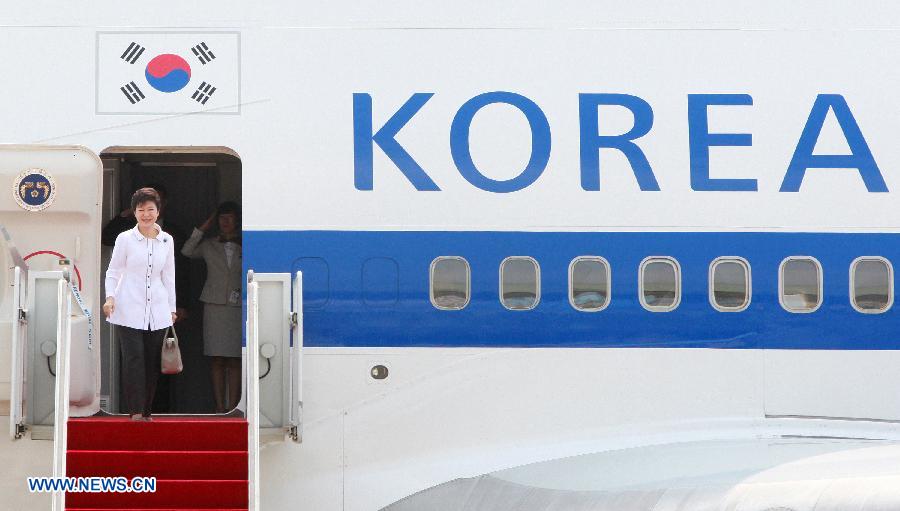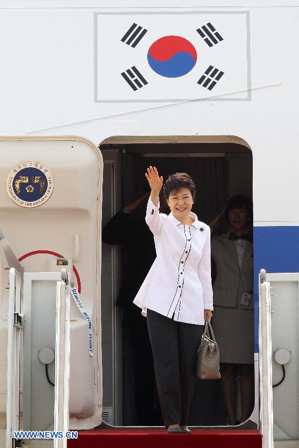 South Korean President Park Geun-hye embarks a plane at an airport in Seongnam, South Korea, June 27, 2013. Park Geun-hye flew to China on Thursday for a four-day visit. (Xinhua/Park Jin-hee)