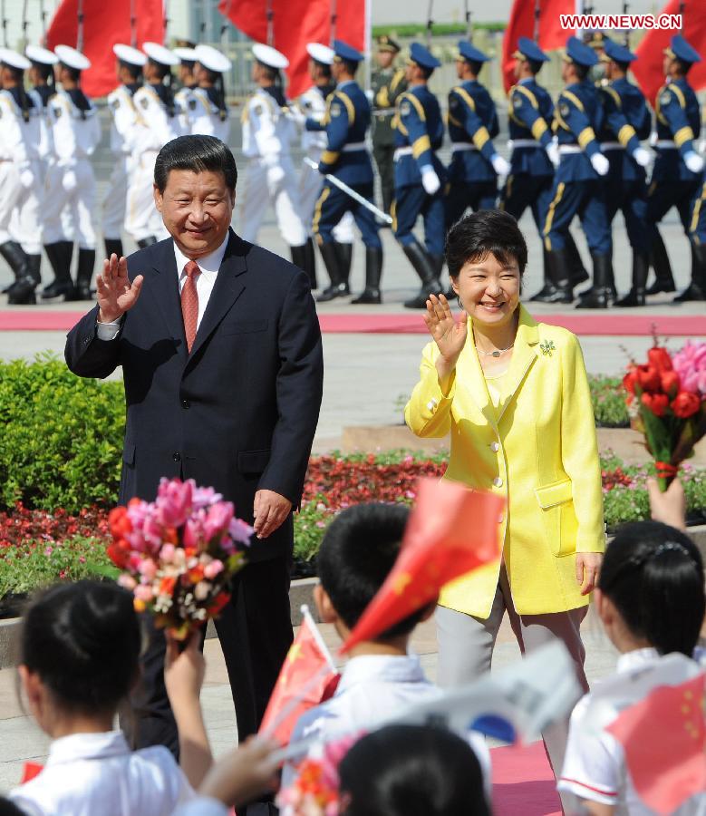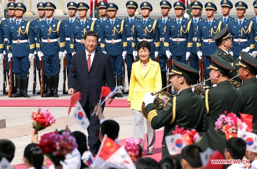 Chinese President Xi Jinping (L) holds a welcoming ceremony for visiting South Korean President Park Geun-hye before their talks at the Great Hall of the People in Beijing, capital of China, June 27, 2013. (Xinhua/Yao Dawei)