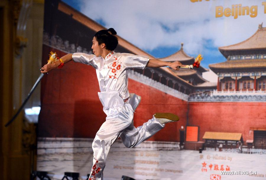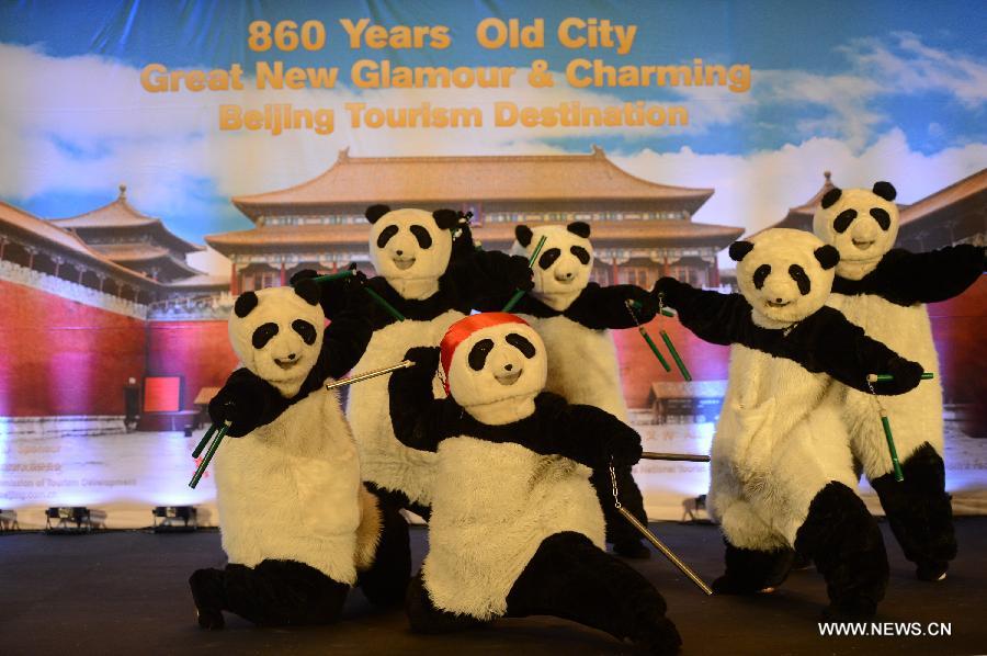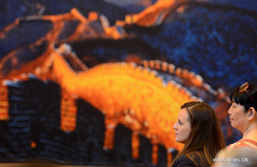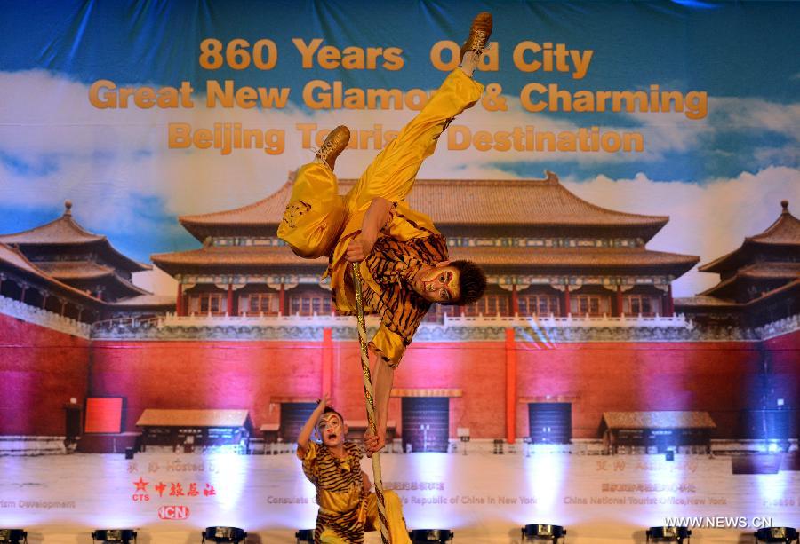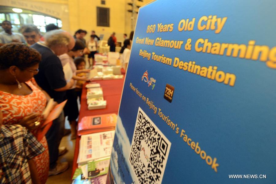 People view Beijing tourism brochures at the "Beijing Tourism" Event debut ceremony at the Grand Central Terminal in New York City, June 27, 2013. The "Beijing Tourism" event organized by the Beijing Municipal Commission of Tourism Development, had its grand debut at the Vanderbilt Hall of the Grand Central Terminal in the New York City, the first time for the City of Beijing to organize such a tourism theme-based public event.(Xinhua/Wang Lei)