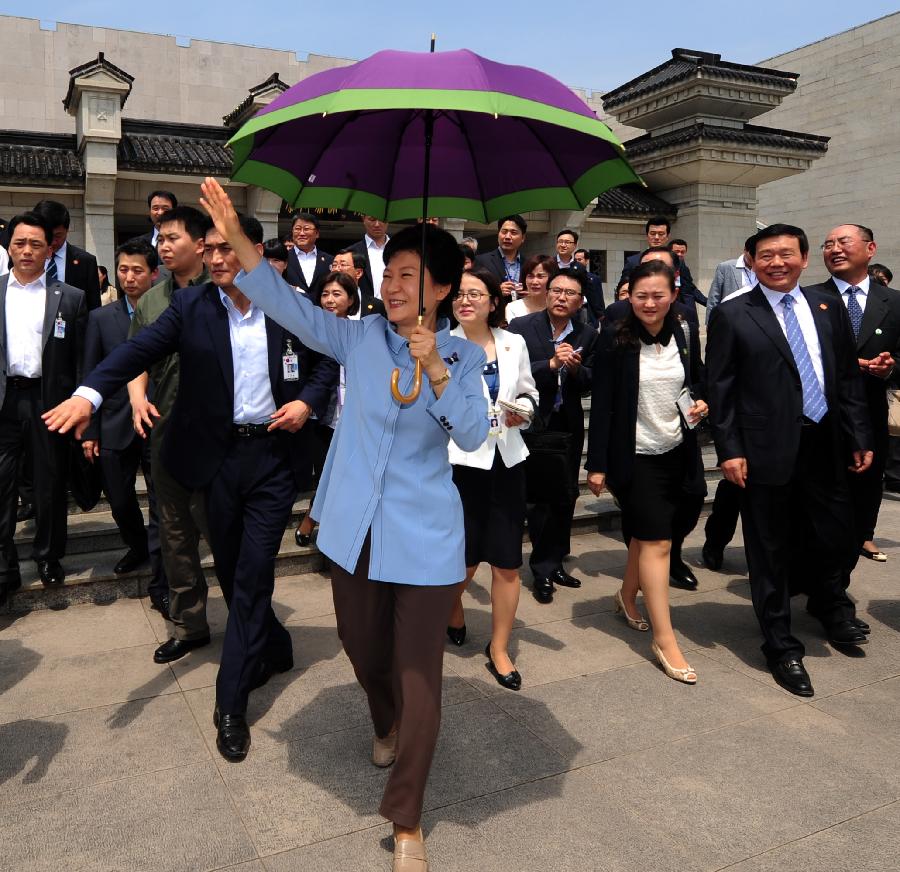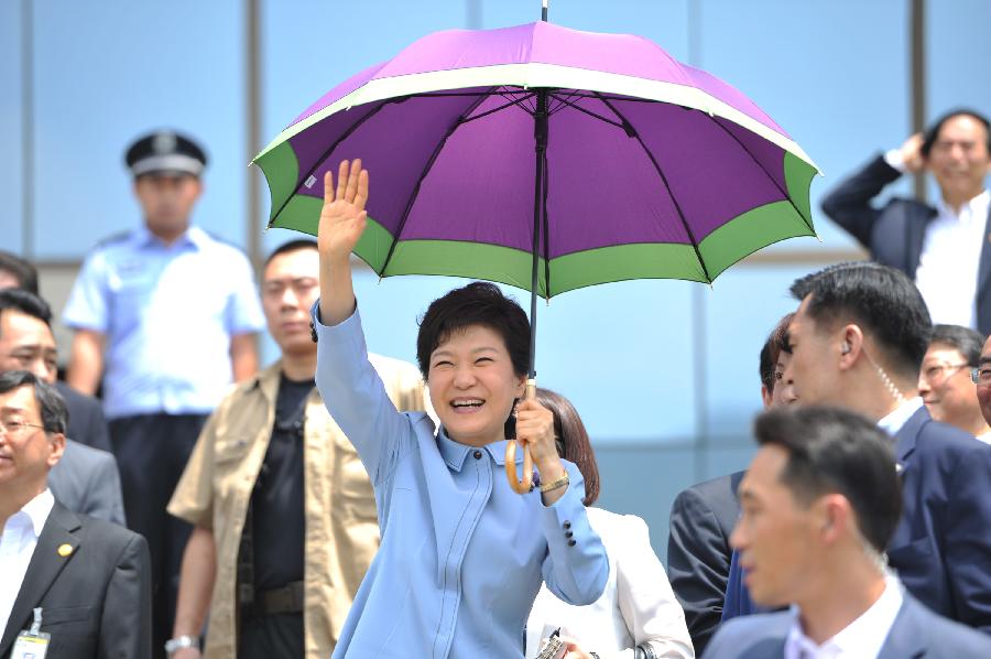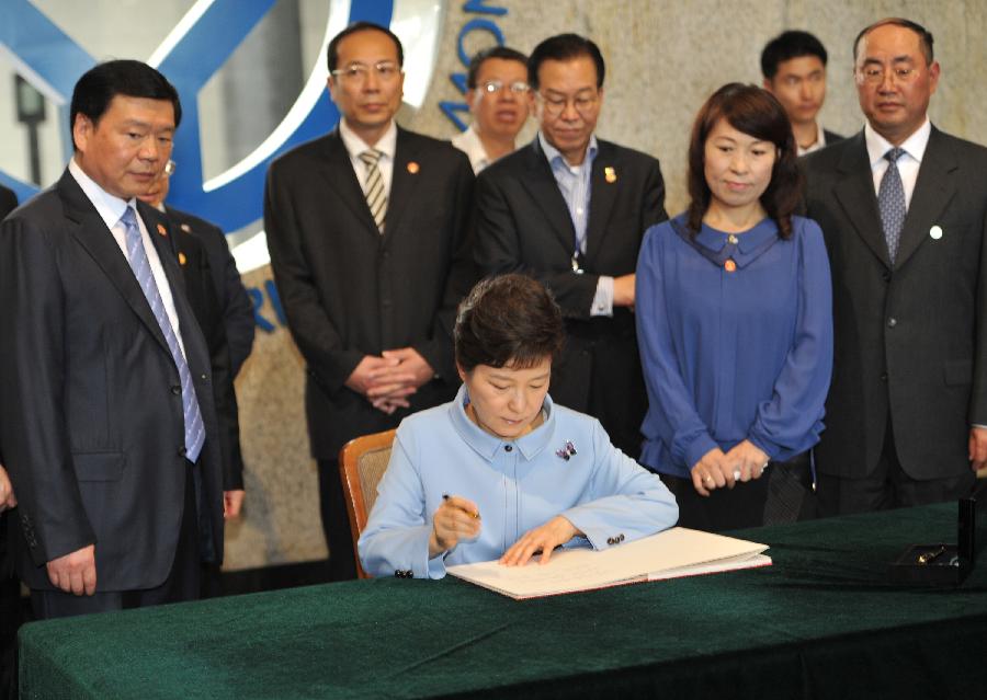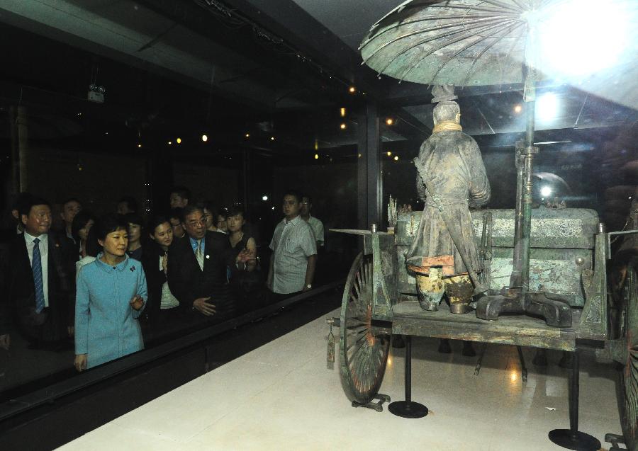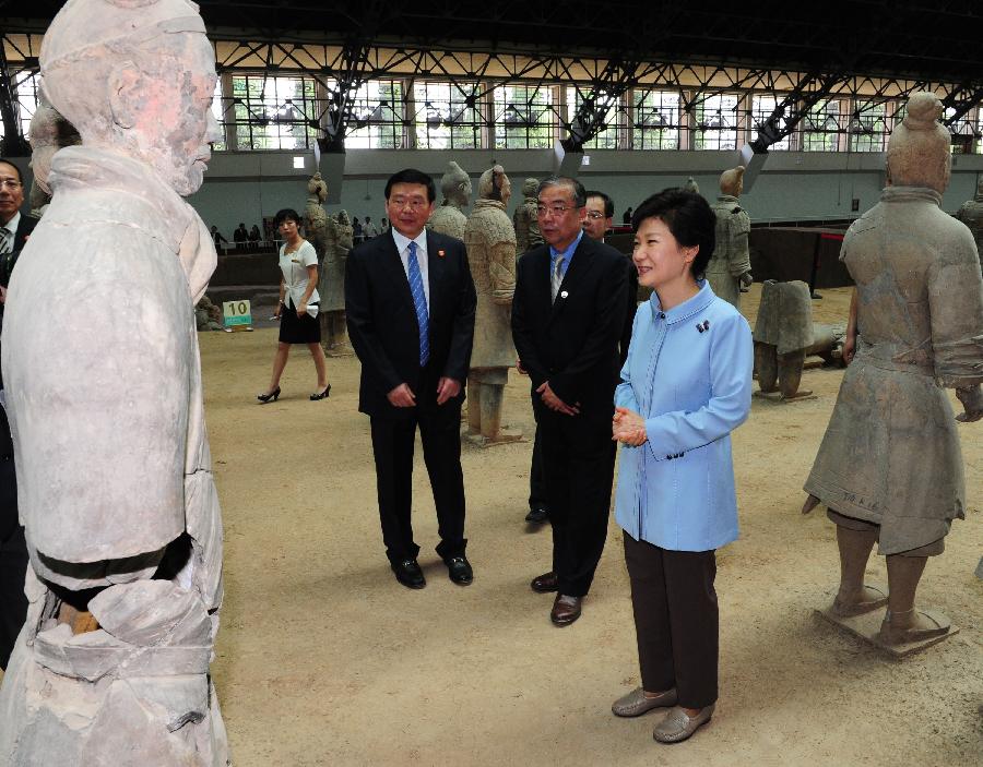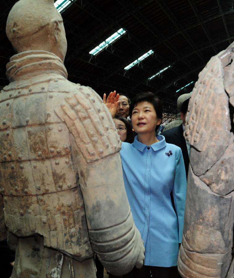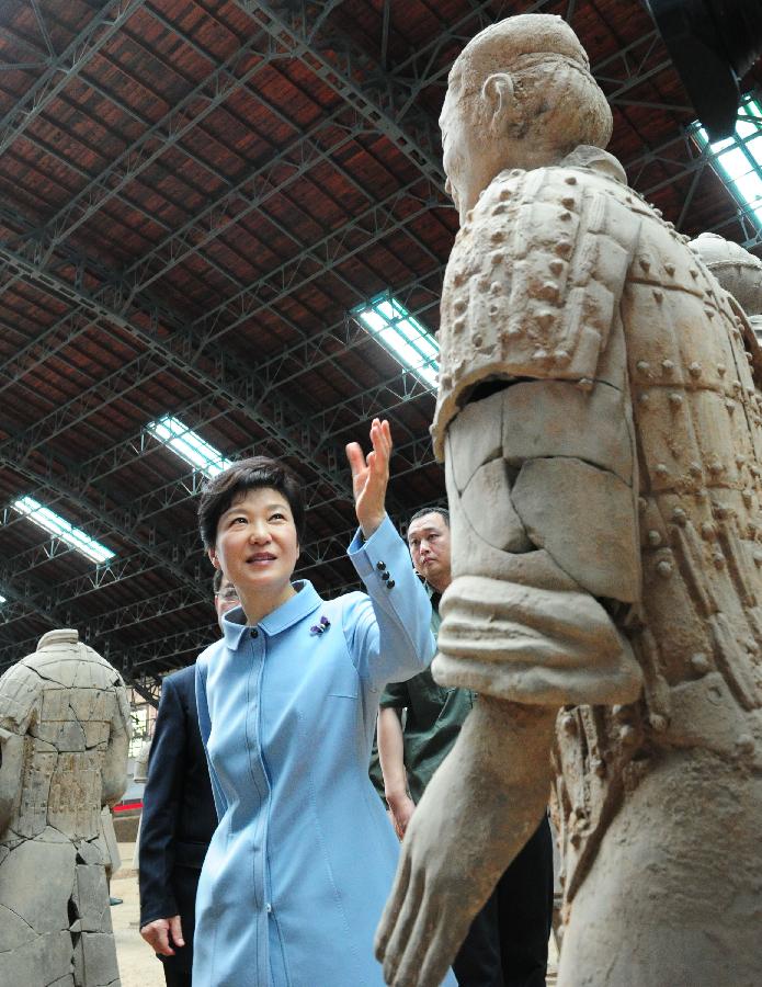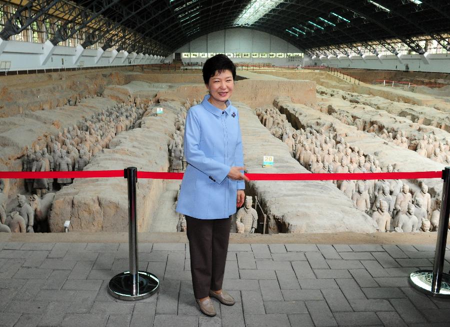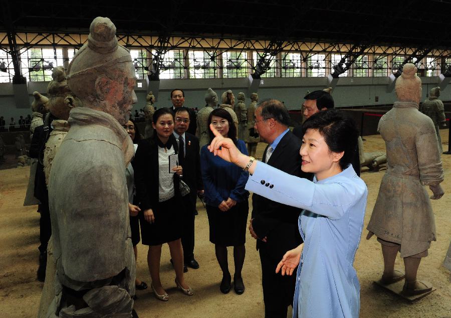 Republic of Korea (ROK) President Park Geun-hye visits the ancient terracotta army, buried for centuries to guard the tomb of China's first emperor Qinshihuang of the Qin Dynasty (221 BC-207 BC), in Xi'an, capital city of northwest China's Shaanxi Province, on June 30, 2013. (Xinhua/Ding Haitao)