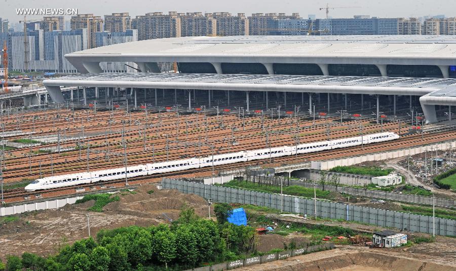 A bullet train on its trial trip enters the Hangzhou East Station in Hangzhou City, capital of east China's Zhejiang Province, June 30, 2013. A new high-speed railway that stretches across east China's Yangtze River Delta went into commercial service on July 1. The Nanjing-Hangzhou-Ningbo high-speed railway, with a designated top speed of 350 km per hour, will cut travel time between Nanjing, capital of east China's Jiangsu Province, and the port city of Ningbo in east China's Zhejiang Province to about two hours. High-speed trains will run at a speed of 300 km per hour during the initial operation period. (Xinhua/Tan Jin)