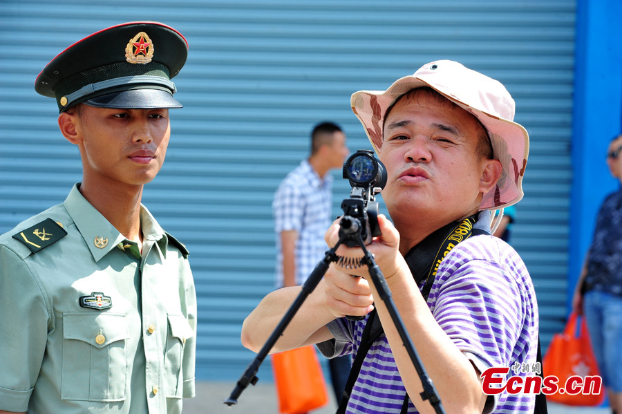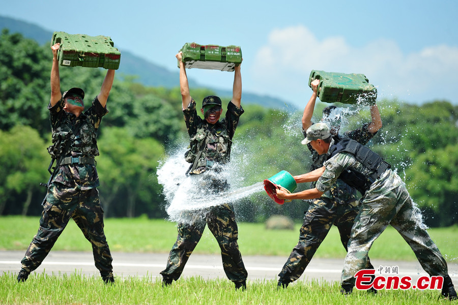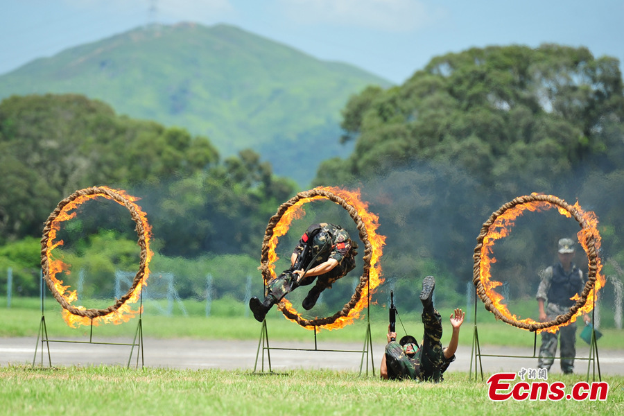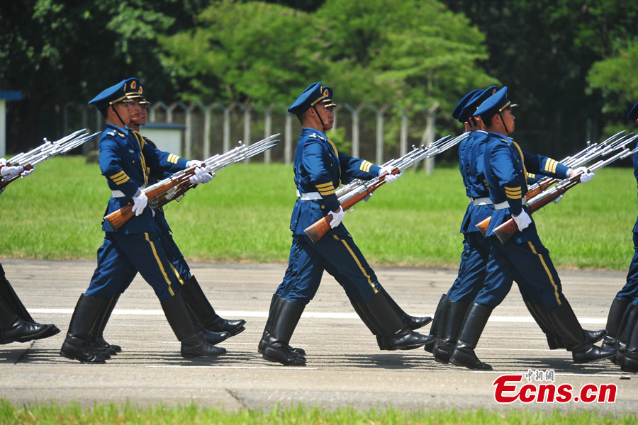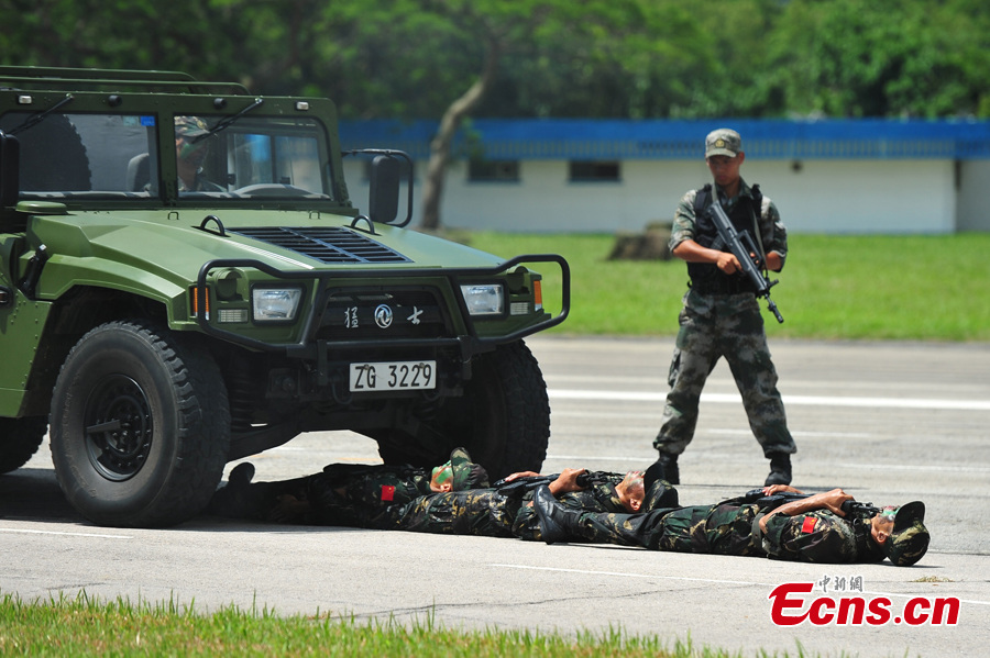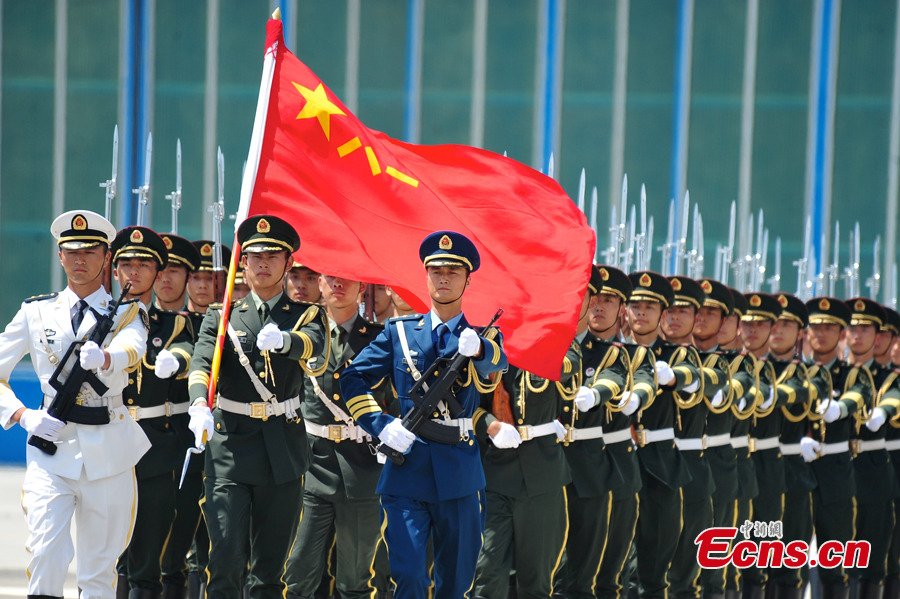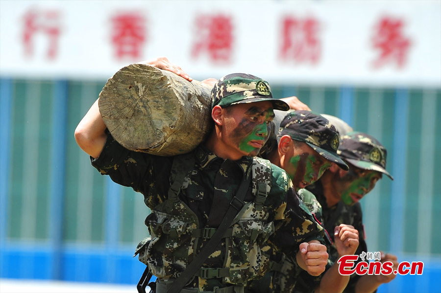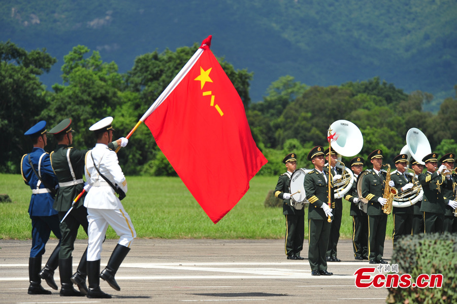 PLA navy soldiers march during an open day at the Shek Kong Barracks in Hong Kong on June 30, 2013. Shek Kong Barracks was open to the public on Sunday in celebration of the 16th anniversary of the Special Administrative Region's return to China. [Photo: CNS/Chen Wen]