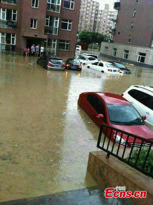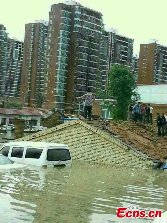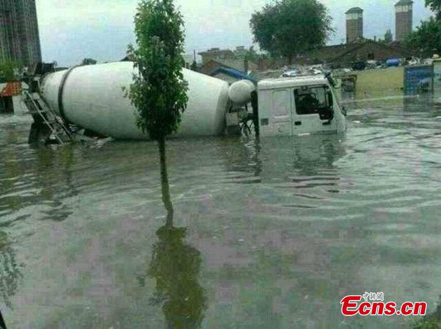 A vehicle is submerged in the flood water in Ordos, North China's Inner Mongolia Autonomous Region, June 30, 2013. Heavy rain and hail hit Dongsheng district in Ordos City at about 3:10 p.m. (0710 GMT) Sunday, leaving 11 people dead and eight missing by the press time. [Photo: CNS/Xu Xiaogang]