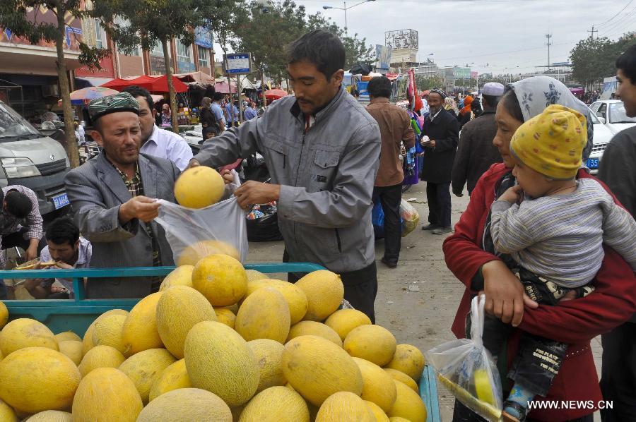 A vendor makes a local snack at the Id Kah Bazaar in the city of Hotan, northwest China's Xinjiang Uygur Autonomous Region, July 1, 2013. (Xinhua/Zhao Ge)